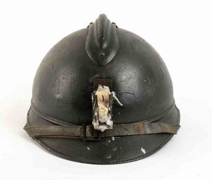 Primo quarto XX sec. elmetto di fabbricazione francese con applicata frontalmente un portamoccolo in ferro, interno [..]
