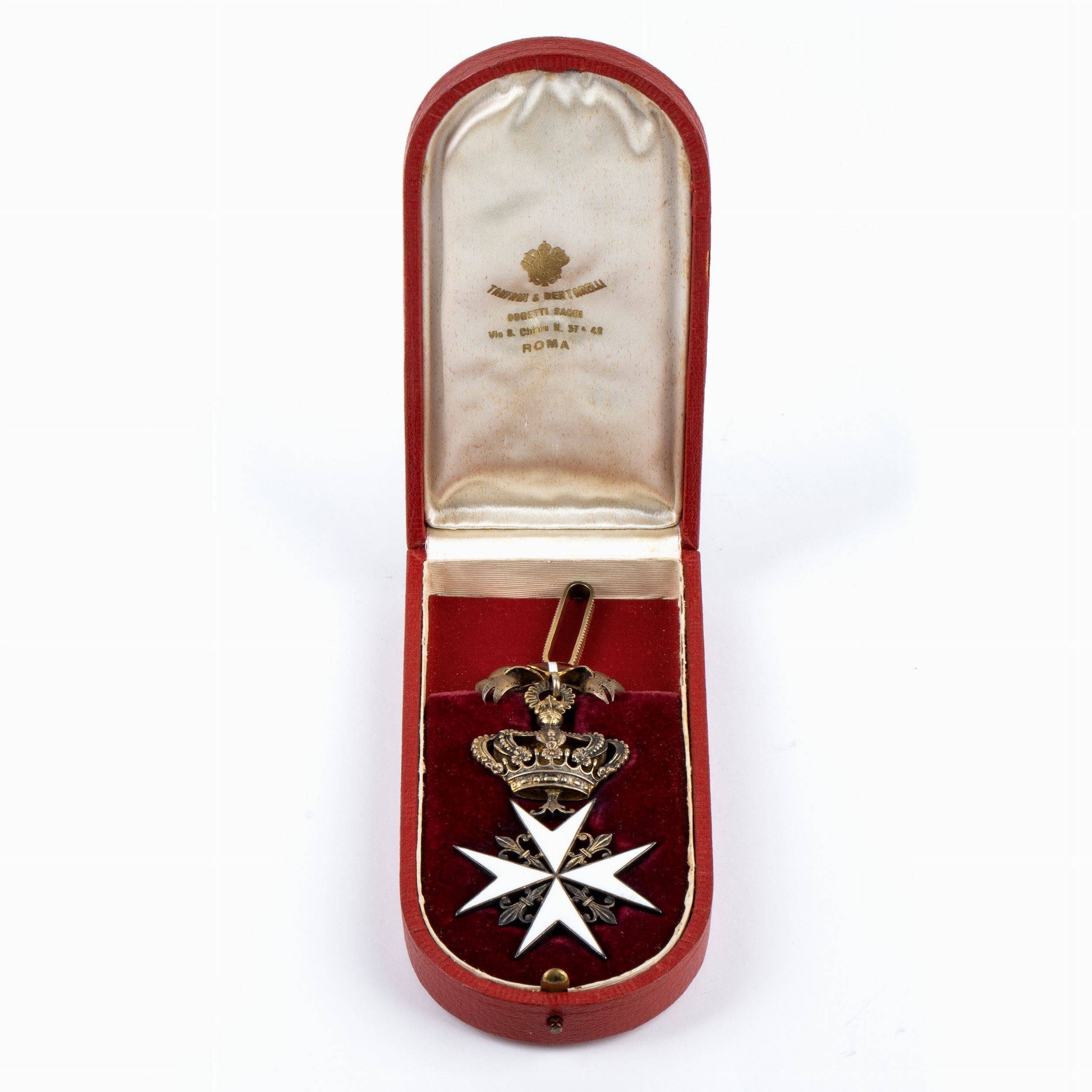 primo quarto XX sec. croce in argento dorato e smalti policromi , in astuccio marcata Tanfani e Bertarelli, ottimo stato