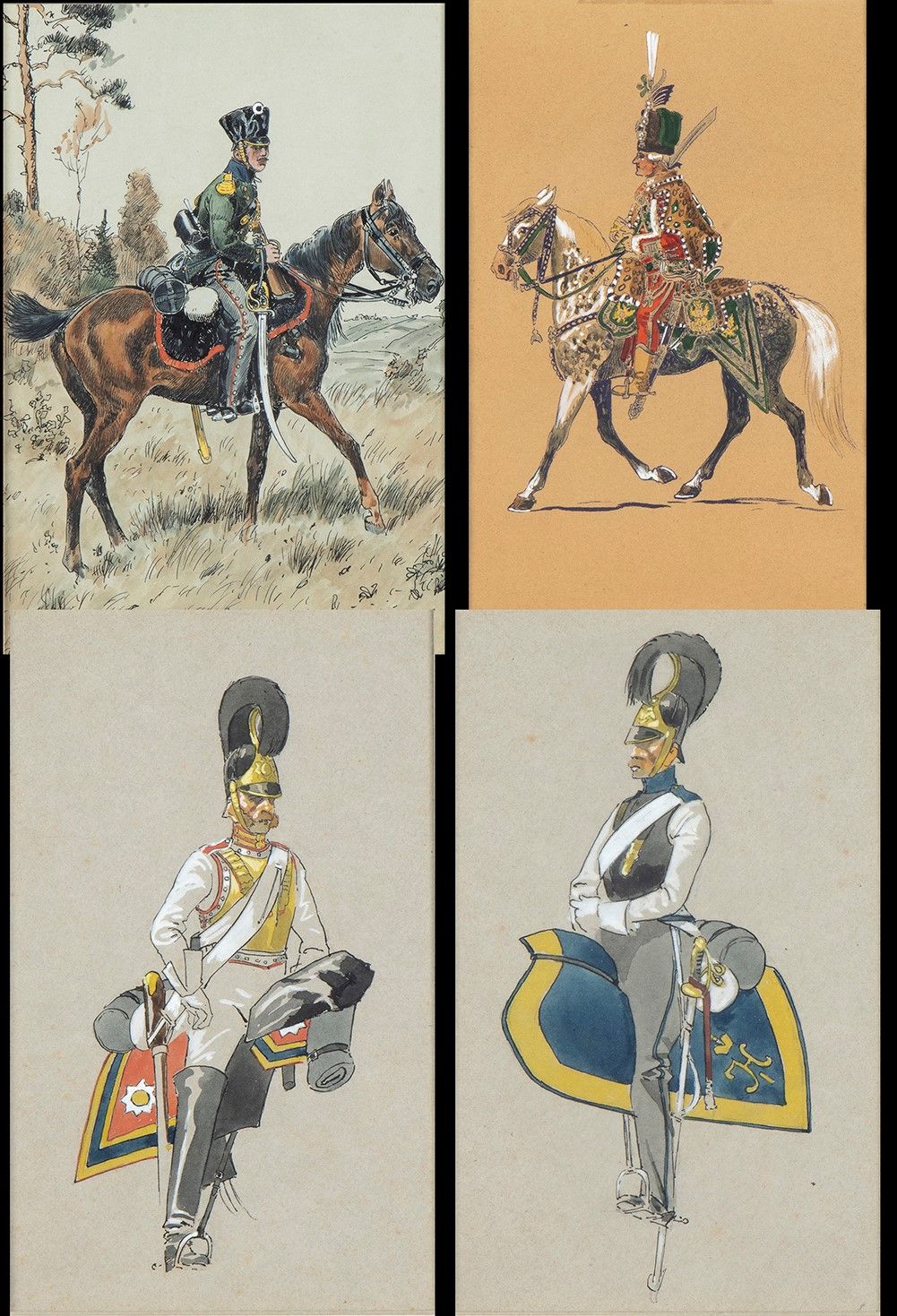 Selezione di stampe raffiguranti uniformi di cavalleria leggera e di cavalleria pesante