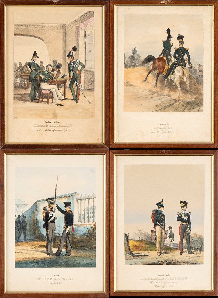 Lotto di tre stampe acquarellate, la prima raffigurante ufficiali del Gran ducato d'Assia, la seconda un trombettiere ed un ufficiale di cavalleria del regno di Sassonia, la terza un ufficiale ispezionante un fante del ducato di Sassonia-Altenburg e la quarta un ufficiale ed un fante del battaglione di fanteria leggera del Gran ducato di Mecleburgo.
