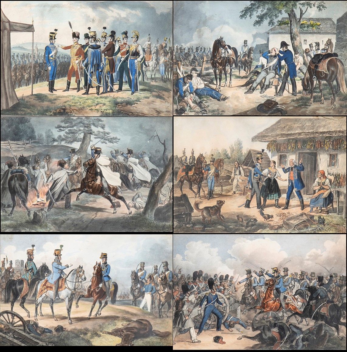 Sei stampe acquarellate raffiguranti scene militari dell'esercito militare austr [..]