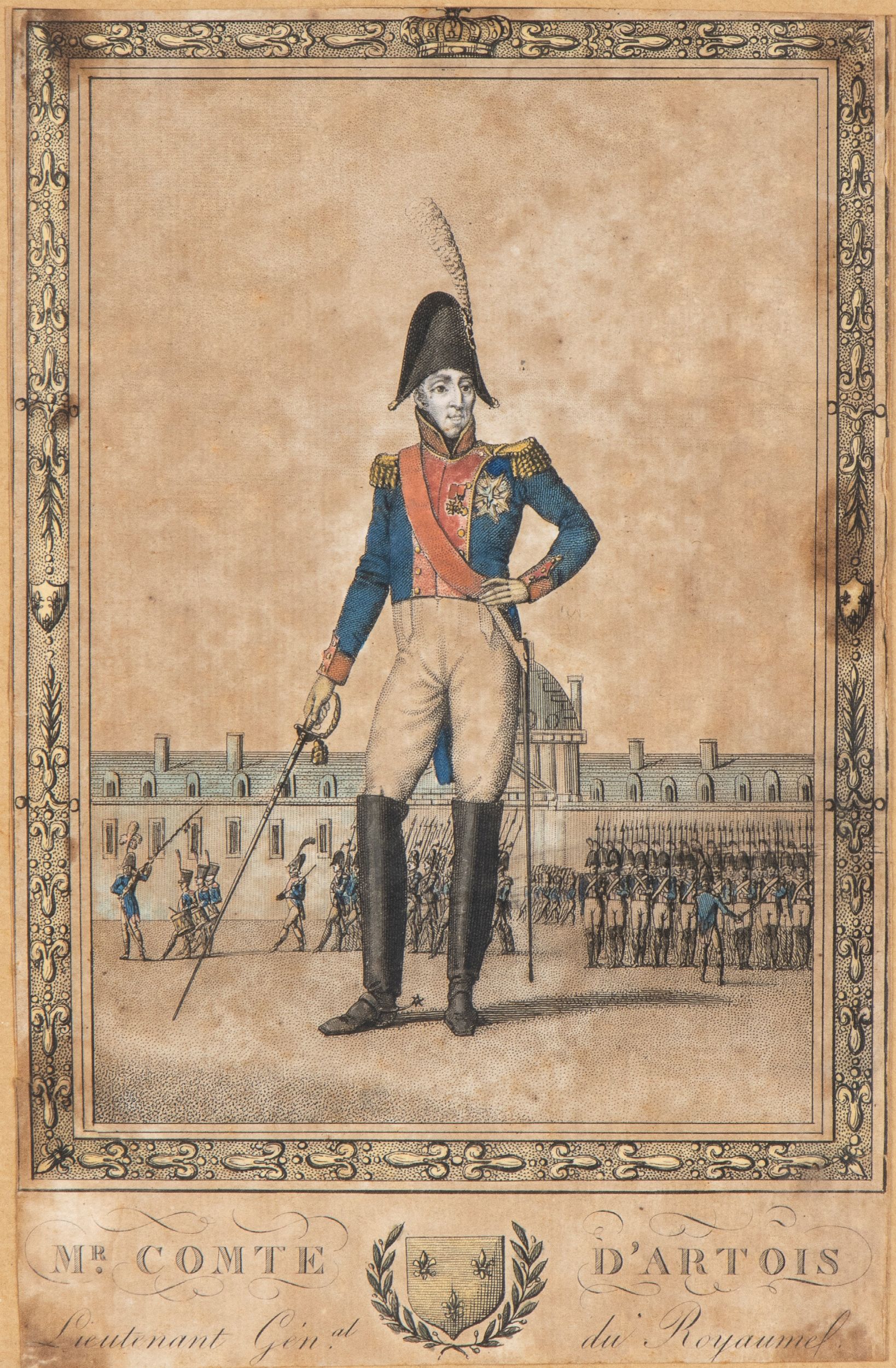 Stampa acquarellata raffigurante il Conte D'Artois in uniforme con alle spalle fanti schierati