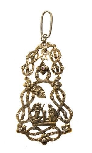 ORDINI E MEDAGLIE - ITALIA, ANTICHI STA... ORDINE SUPREMO DELLA SS ANNUNZIATA, PENDENTE DEL PICCOLO COLLARE CON GIOIE, ORO, TRENTASETTE DIAMANTI ED UN RUBINO, PENDENTE FORMATO DA TRE NODI CON AL CENTRO ANNUNCIAZIONE DI MARIA VERGINE, AGGIUNTI A SNODO ALTRI DUE NODI DI SAVOIA IN VERTICALE, AL VERSO MARCHI INDECIFRABILI, 1850 CIRCACON ROSETTA IN ALTO E FIOCCO POSTO SOPRA LA ROSETTA CENTRALE PORTA AL CENTRO UN RUBINO, I DUE NODI AGGIUNTI HANNO SUPERFICI LIEVEMENTE DIFFERENTI, POTREBBE TRATTARSI DEL PENDENTE DI UN PICCOLO COLLARE ADATTATO A PENDENTE DI GRAN COLLARE CON L’AGGIUNTA DI DUE NODI E ROSETTA IN QUANTO LA FATTURA SEMBRA ESSERE LEGGERMENTE DIVERSA