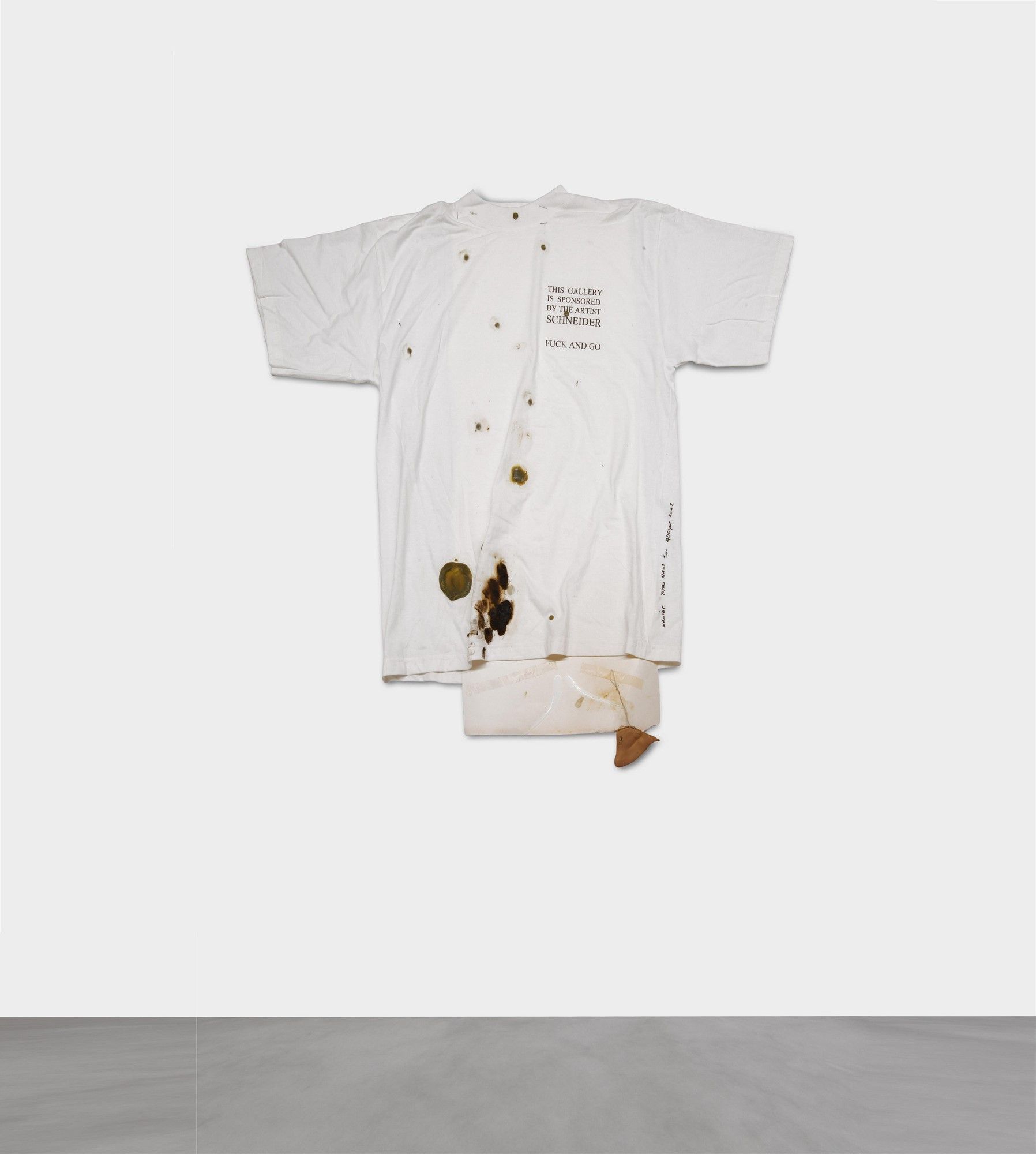Tecnica mista su t-shirt spillata su cartoncino ed elemento in ceramica, spago e scotch, cm 80x91,4