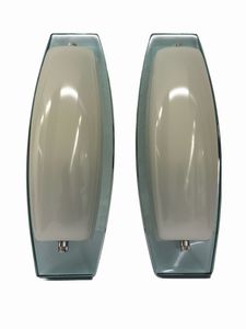 Coppia di applique in vetro opalino bianco e cristallo colorato e molato