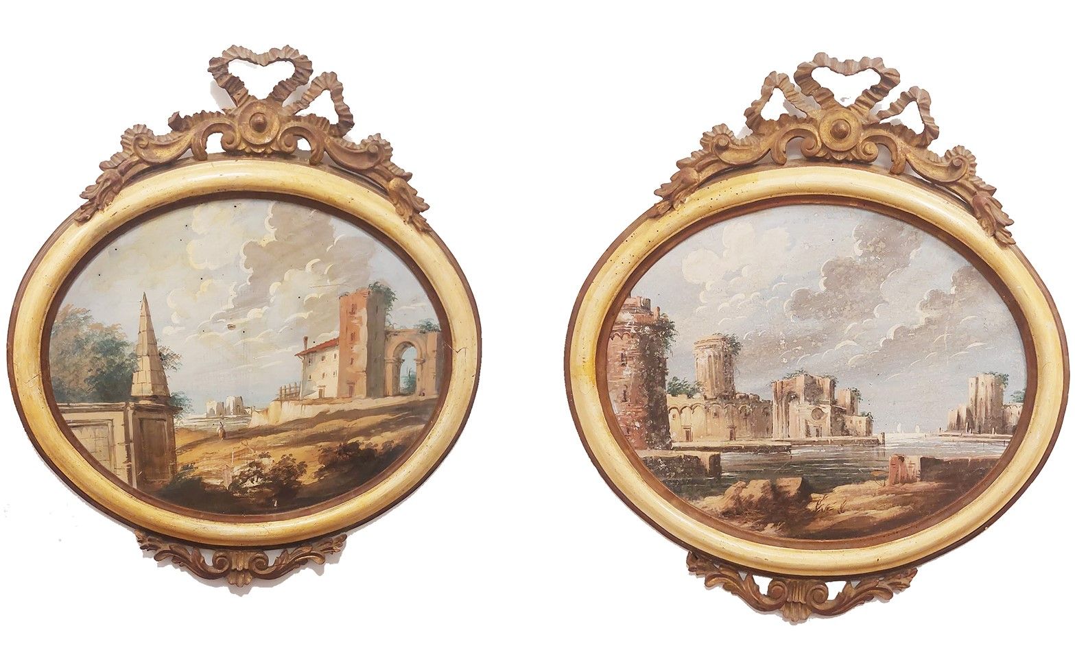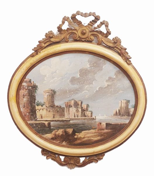entro cornice in legno dipinta con ricca cimasa dorata Il lotto è visibile presso la Blindarte Napoli