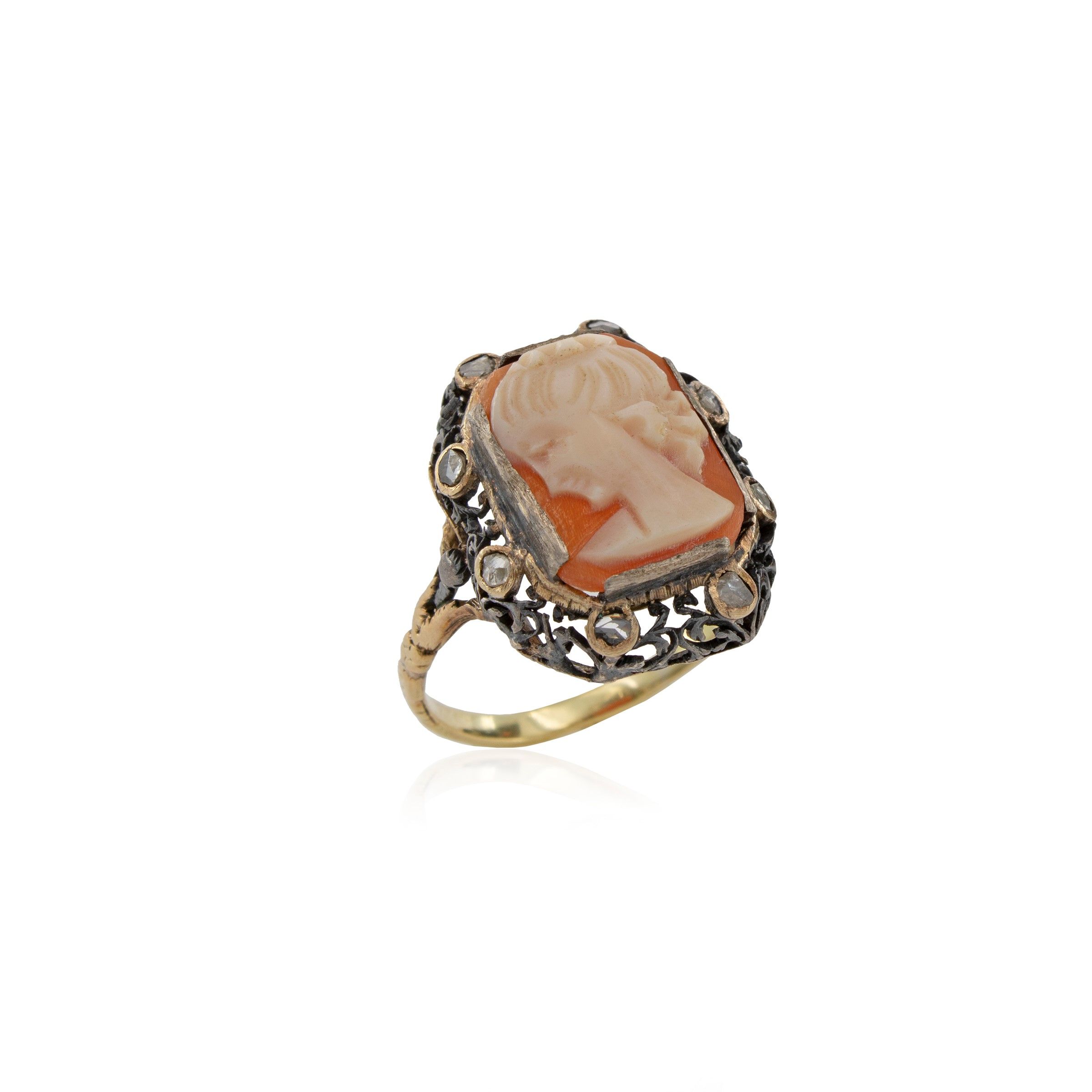 Antico anello in oro 9 kt e argento con cammeo