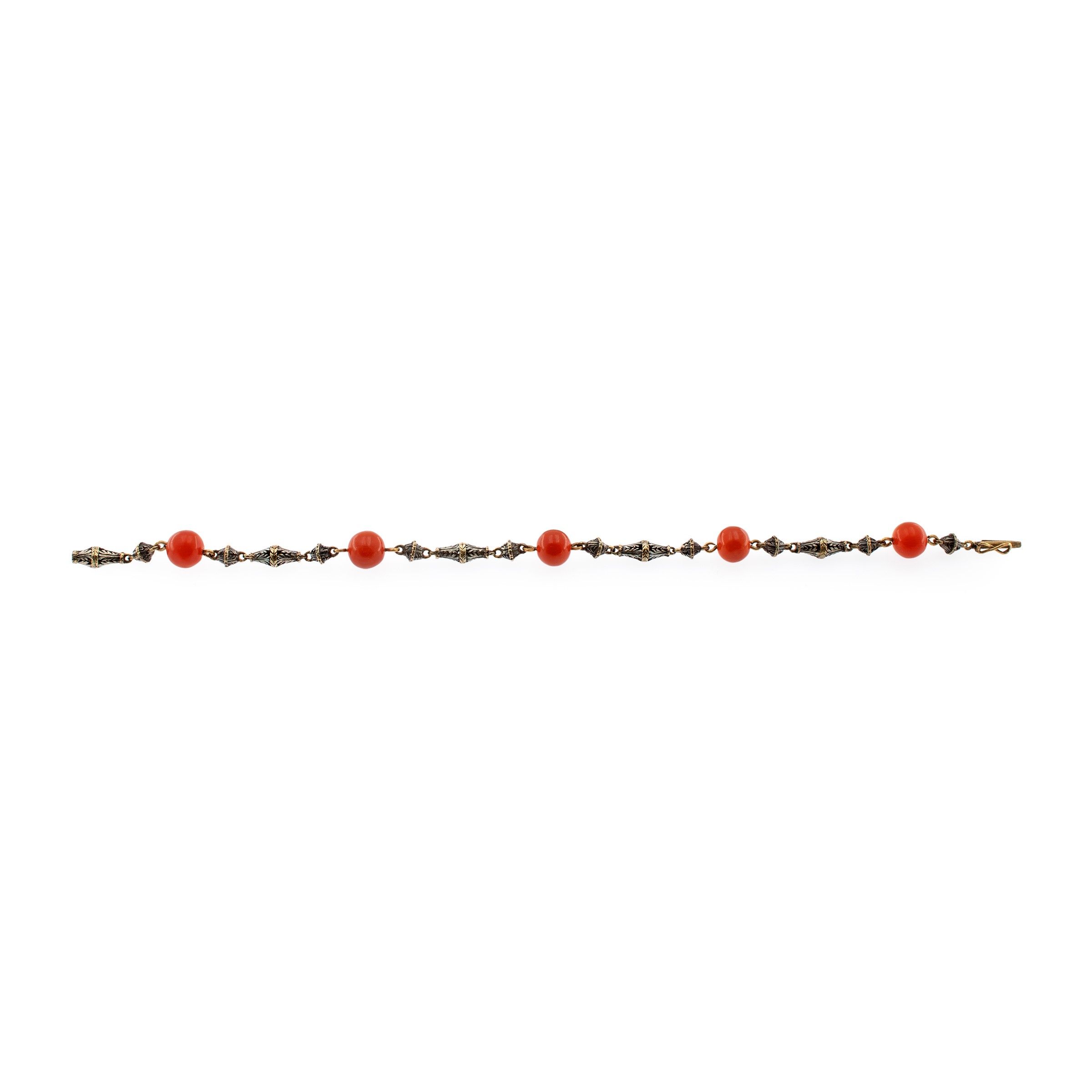 primi 900 rispettivamente uno in corallo e l'altro con sfere di pietre dure alternate da rose di diamante, rubini, zaffiri e smeraldi tondi, mancanze, lunghezza 17 cm.
