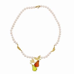 Collana in argento dorato perle fresh water e paste vitree a motivo di frutta