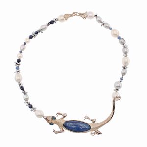 Collana coccodrillo in argento con cianite, perle fresh water e zaffiri