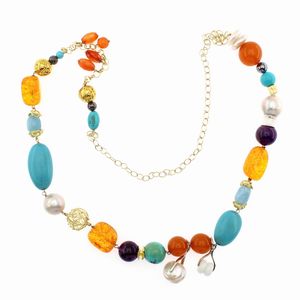 Lunga collana in argento con ambra, ametista, corniola, pasta di turchese, ematite [..]