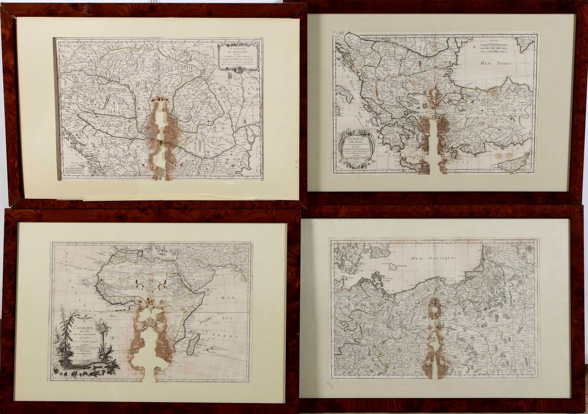 Quattro carte geografiche secolo XVIII, bruciature e difetti, entro cornice