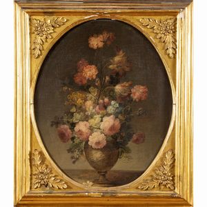 57x49 cm. XVIII-XIX Sec. Natura morta con vaso di fiori, olio su tela, entro cornice