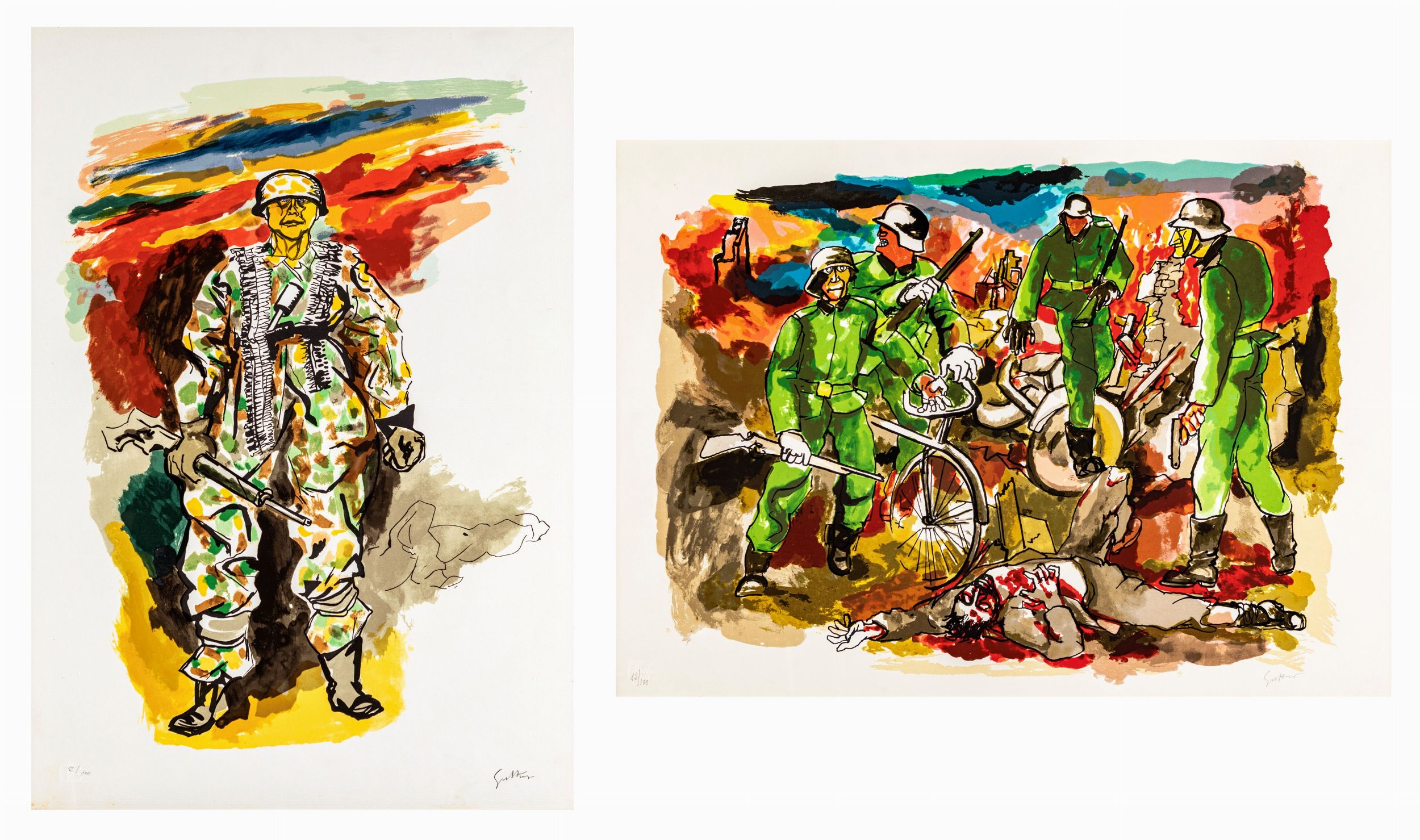 Lotto di due serigrafie entro cornice, entrambe firmate e numerate Guttuso 12/100. Timbro a secco dello stampatore. cm 70x50 l'una - in cornice cm 73x53 e 75x55