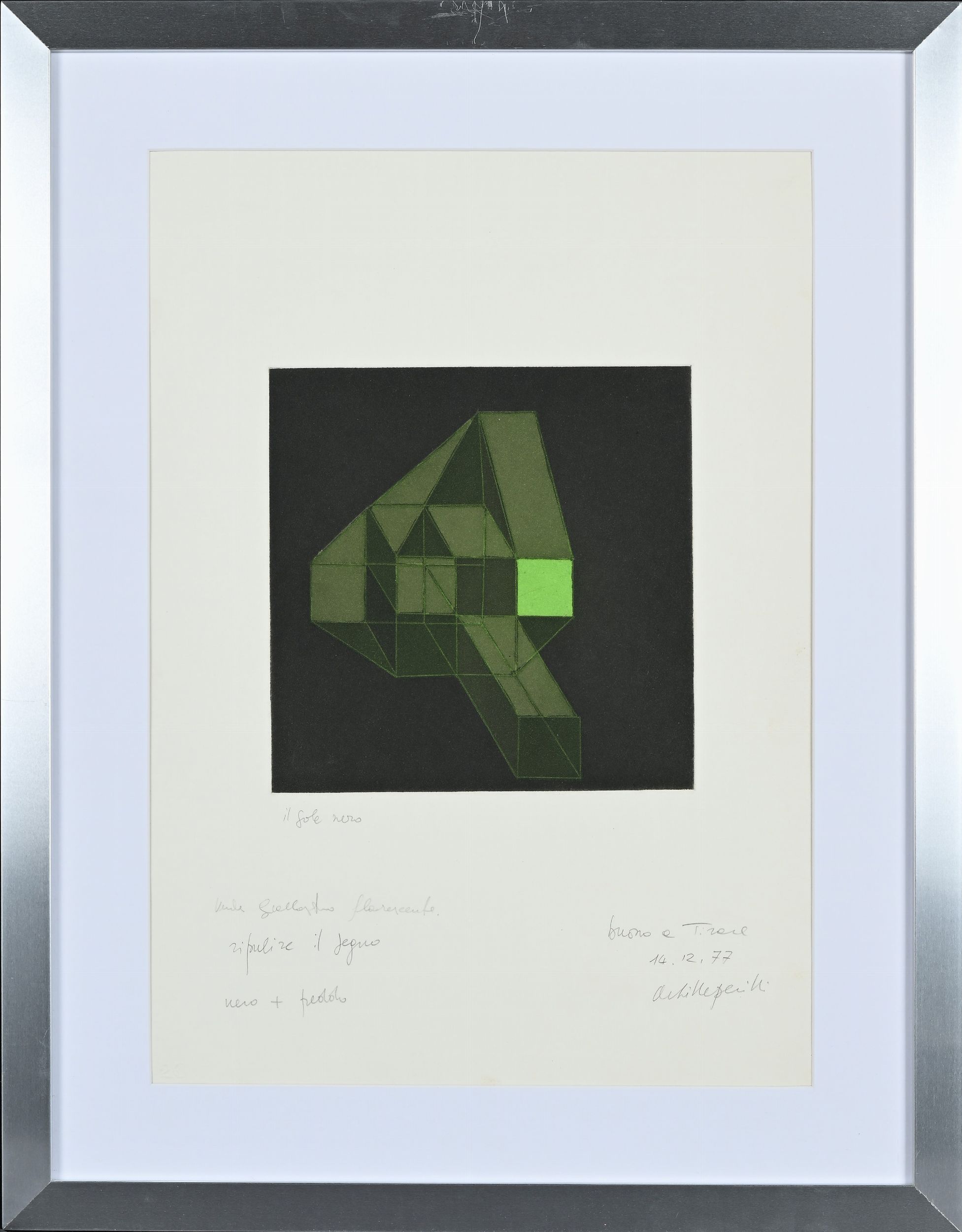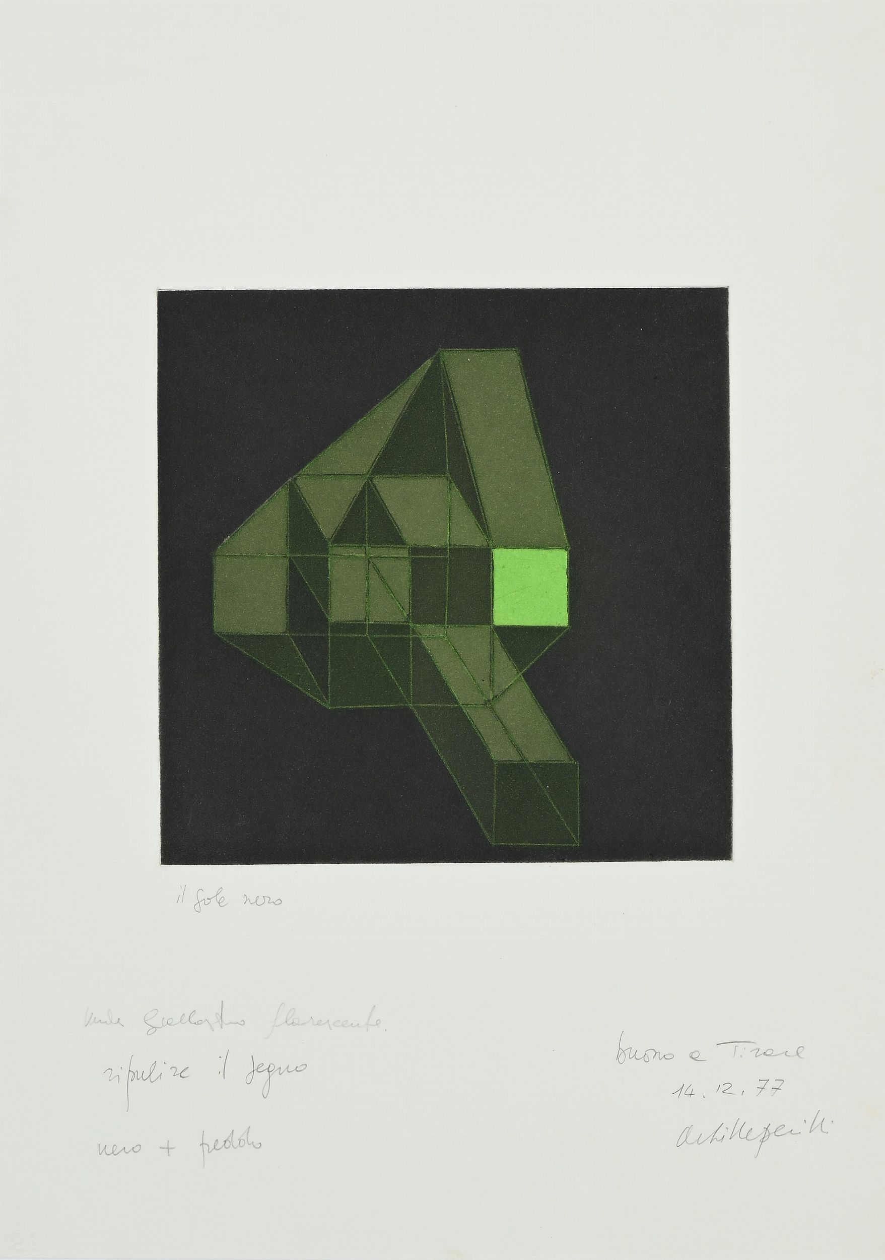 1977 Sul fronte a matita Il Sole Nero, Buono a tirare, 14.12.77, Achille Perilli / Un Giallastro Fluorescente / ripulire il segno / nero + freddo.