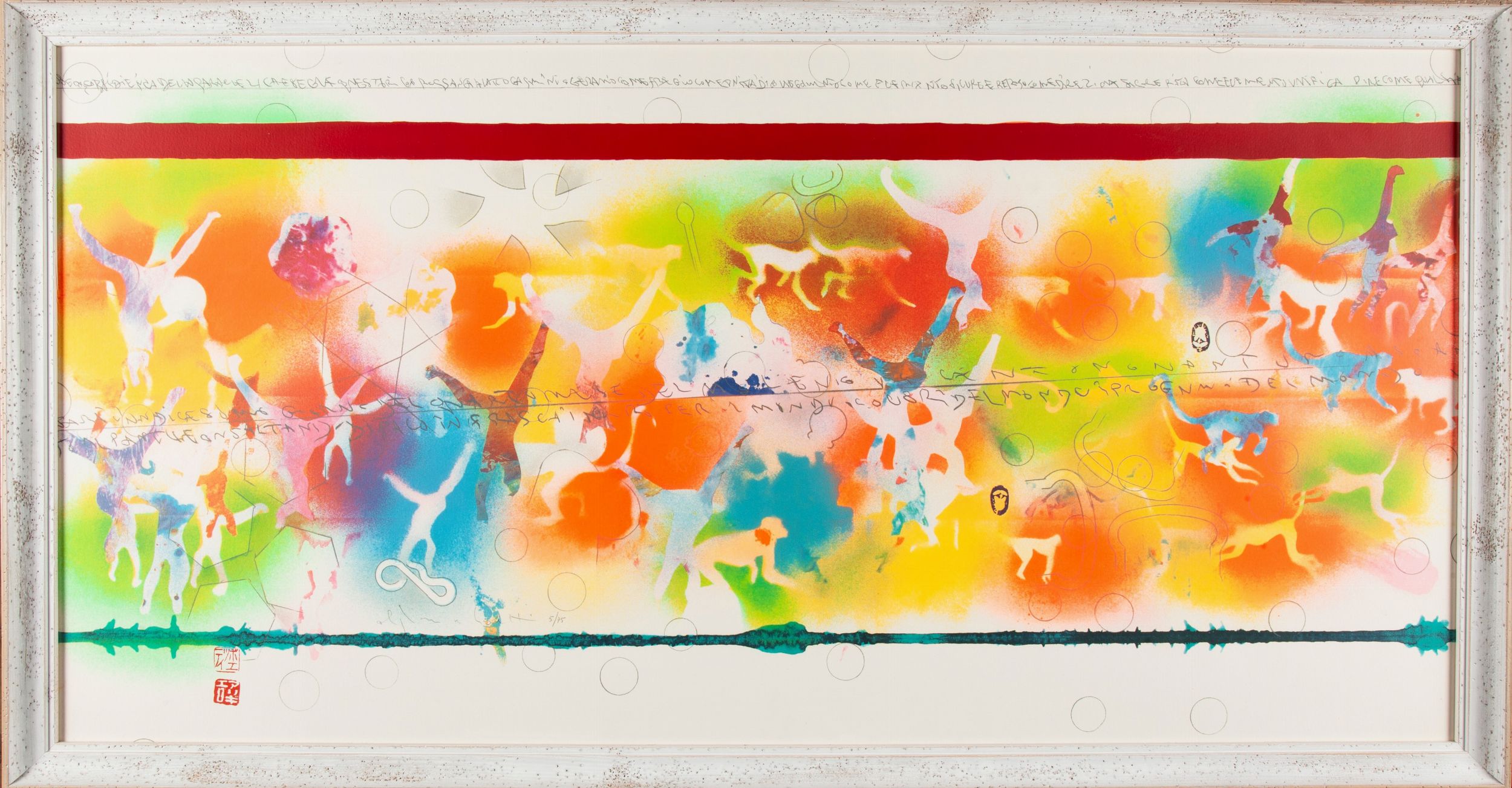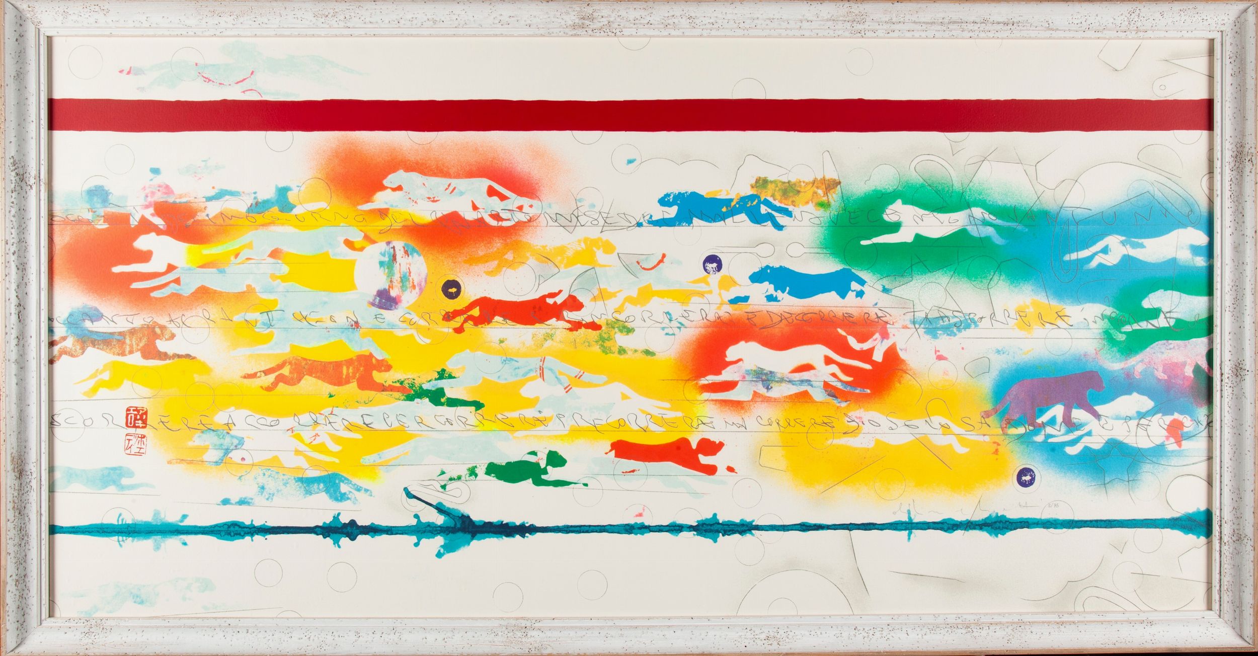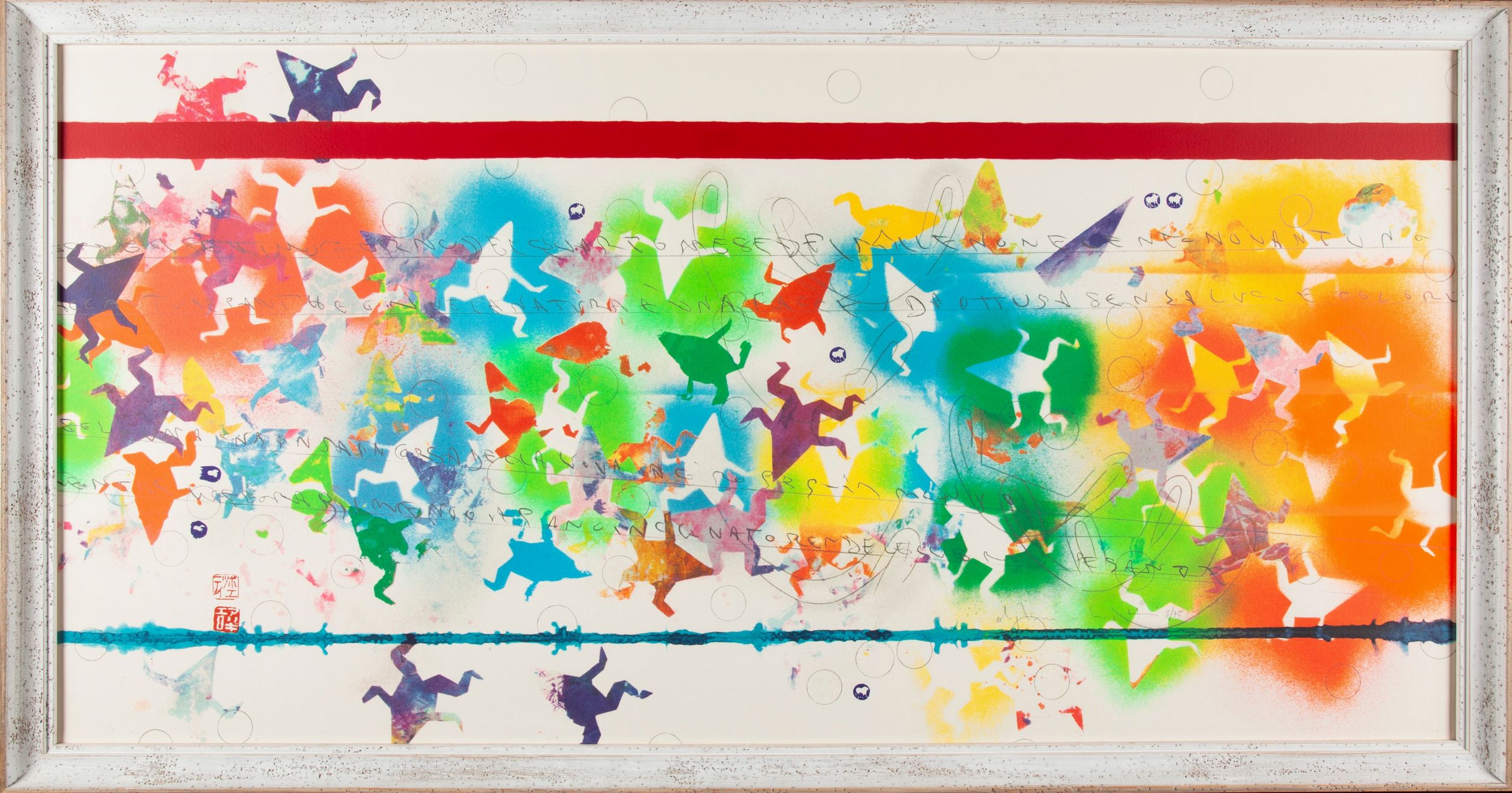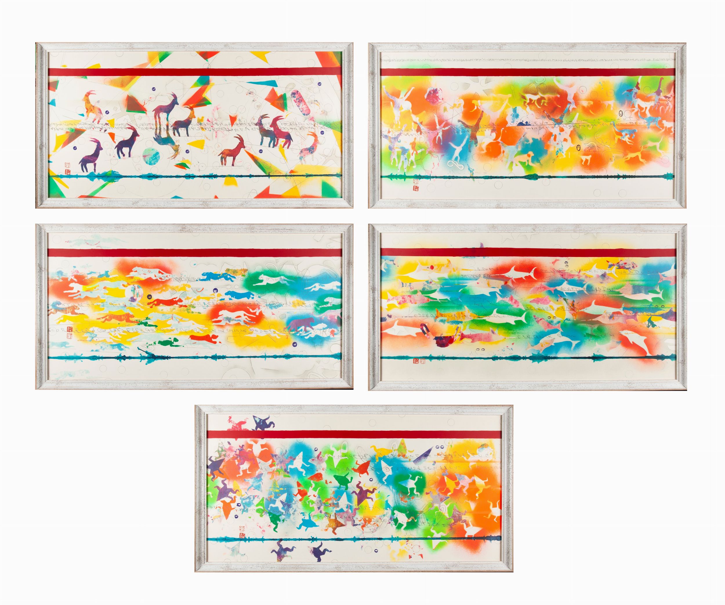 Serigrafia a colori 1991 Cartella completa delle 5 serigrafie (Rane, Stambecchi, Pantere, Pesci, Scimmie), Edizioni Studio Fornaresio, Milano. Ognuna misura cm 60x120 - in cornice cm 67x127. Tutte e 5 le opere sono firmate e numerate Alighiero e Boetti 5/75