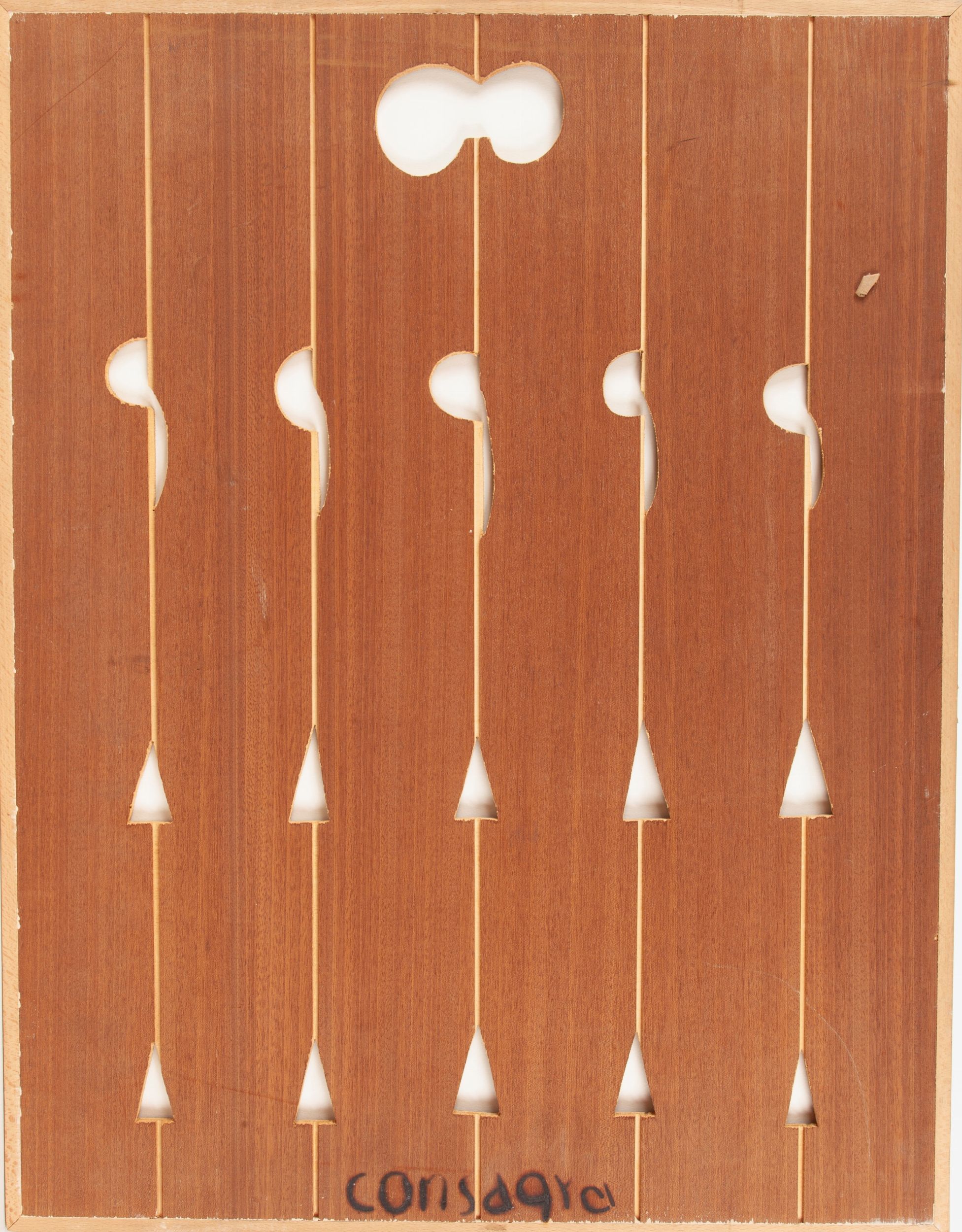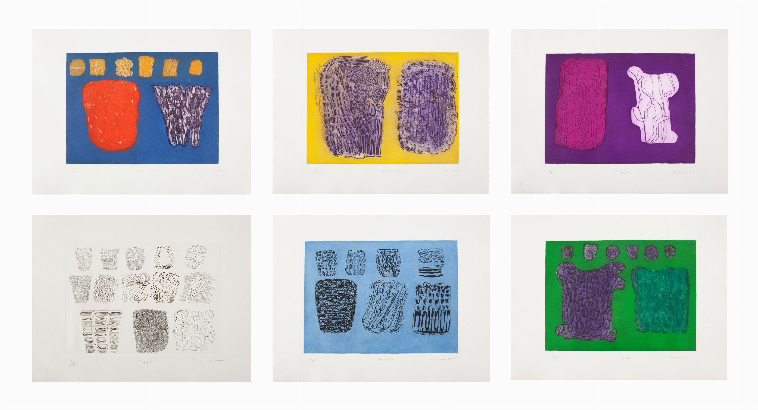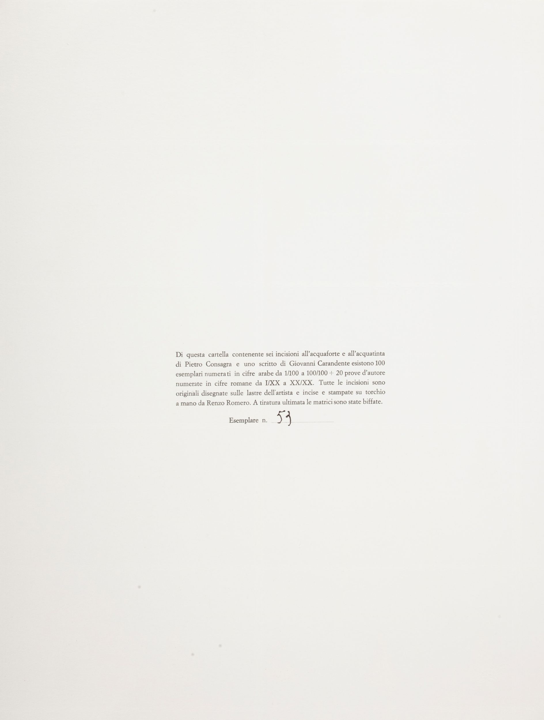 Cartella contenente 6 incisioni all'acquaforte e all'acquatinta di Pietro Consagra, con uno scritto di Giovanni Carandente. Tutte le incisioni sono titolate,firmate e numerate Consagra 53/100 e misurano cm 50x65 l'una. Entro cofanetto originale in legno