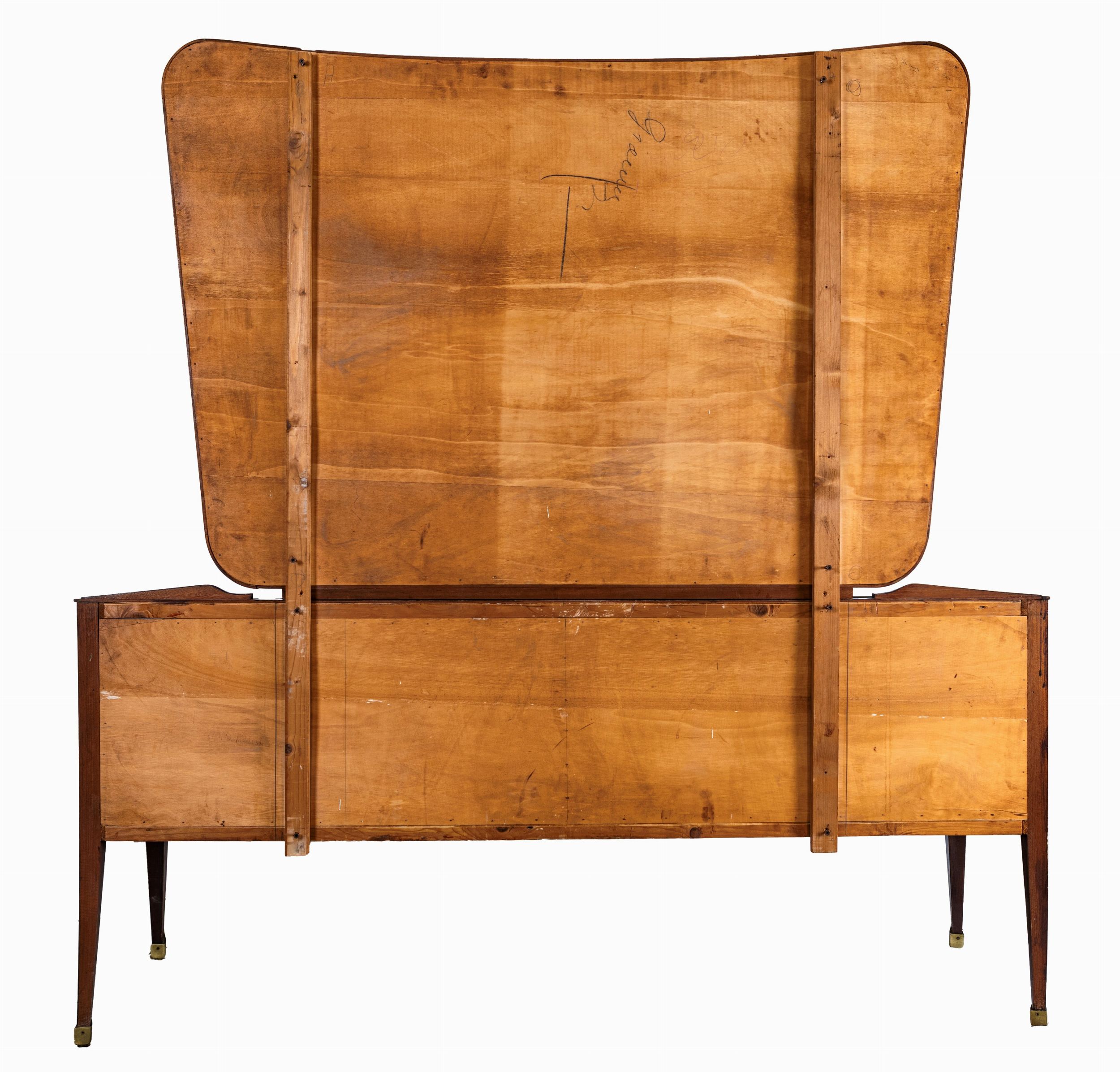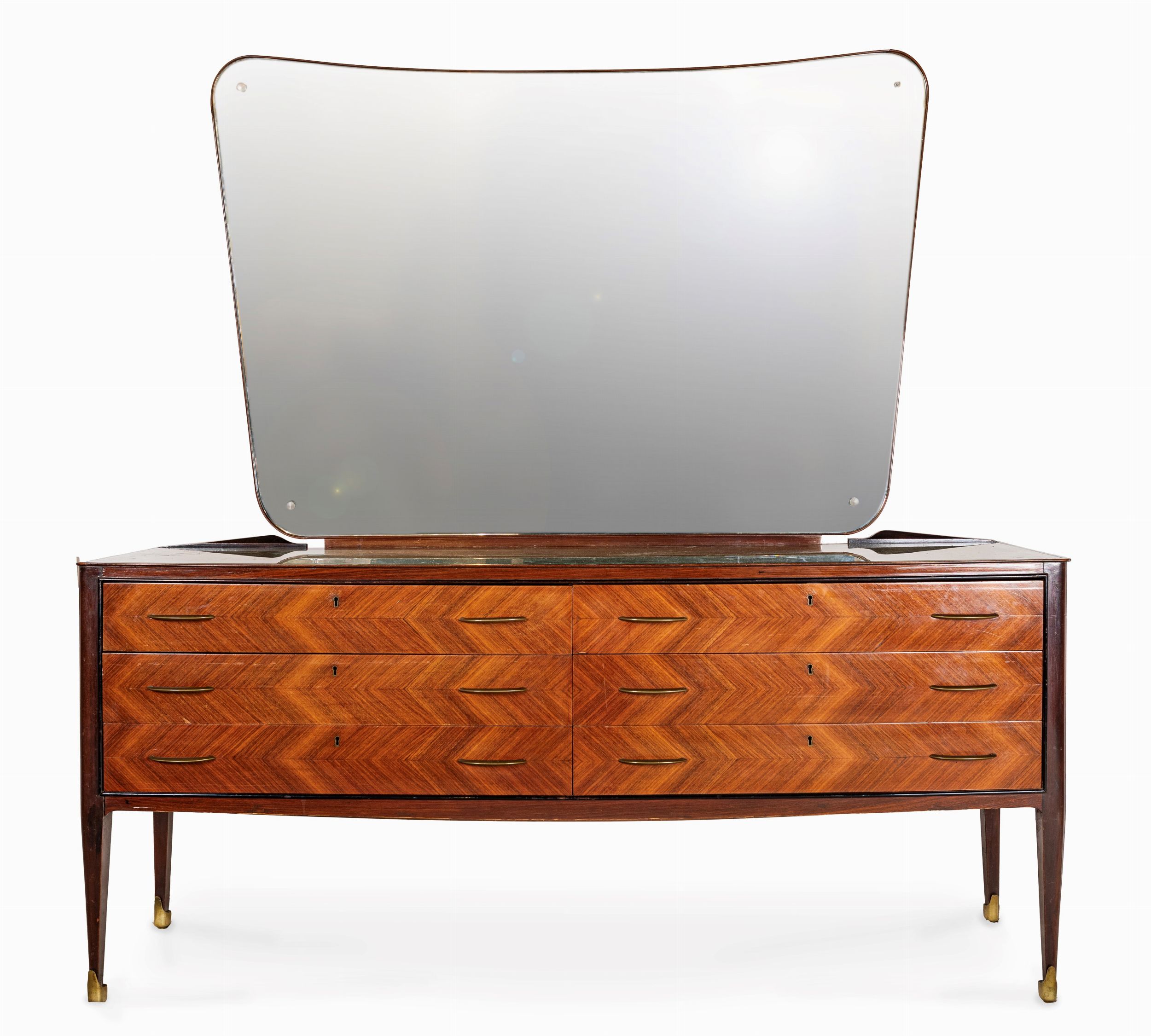 Anni '50 Struttura in legno, maniglie e puntali in ottone. Sei cassetti e piano in vetro incassato. Con specchiera sagomata
