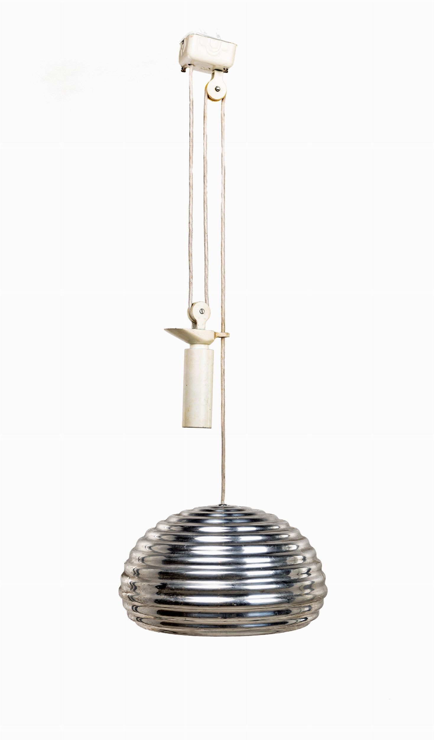 Lampada a sospensione con riflettore in alluminio tornio in lastra. Produzione Flos