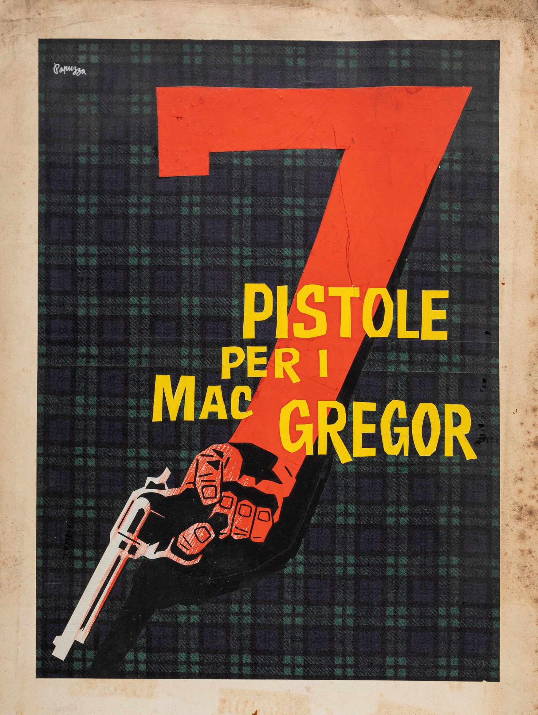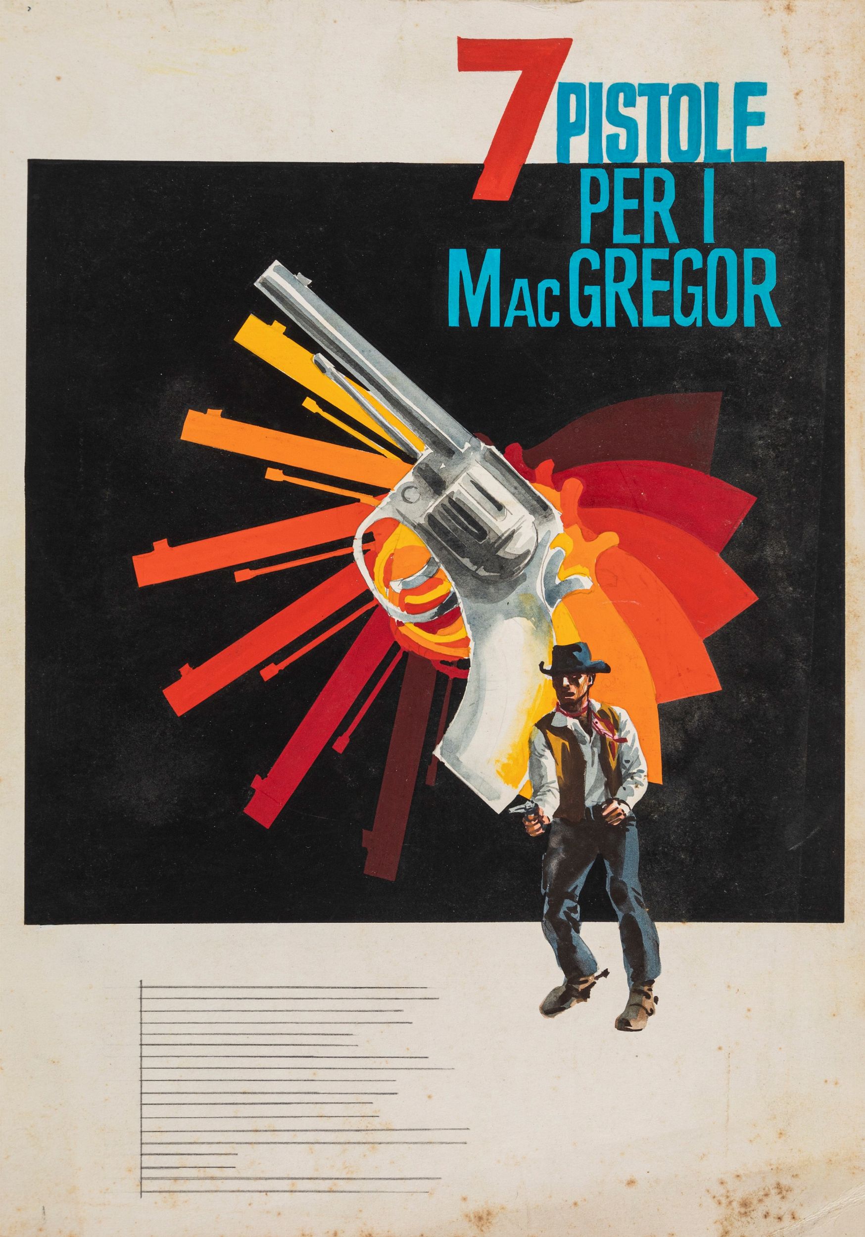 tempera su cartoncino, 25,5 x 35 cm ciascuno 1966 Lotto di 7 bozzetti preliminari realizzati da Papuzza per la locandina del film 7 pistole per i MacGregor, diretto da Franco Giraldi con Robert Woods e Agata Flori nel 1966. Lievi pieghe. Uno firmato.