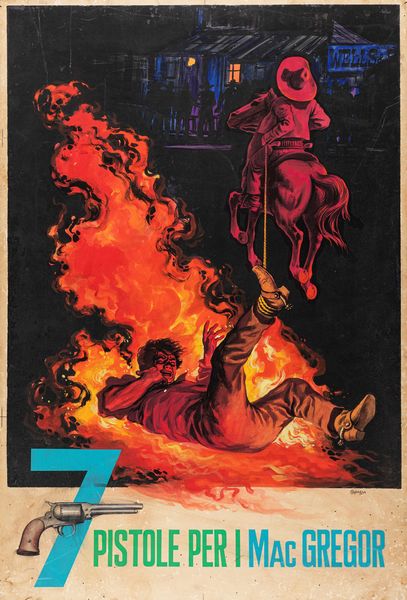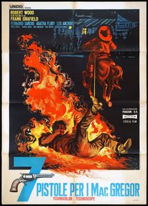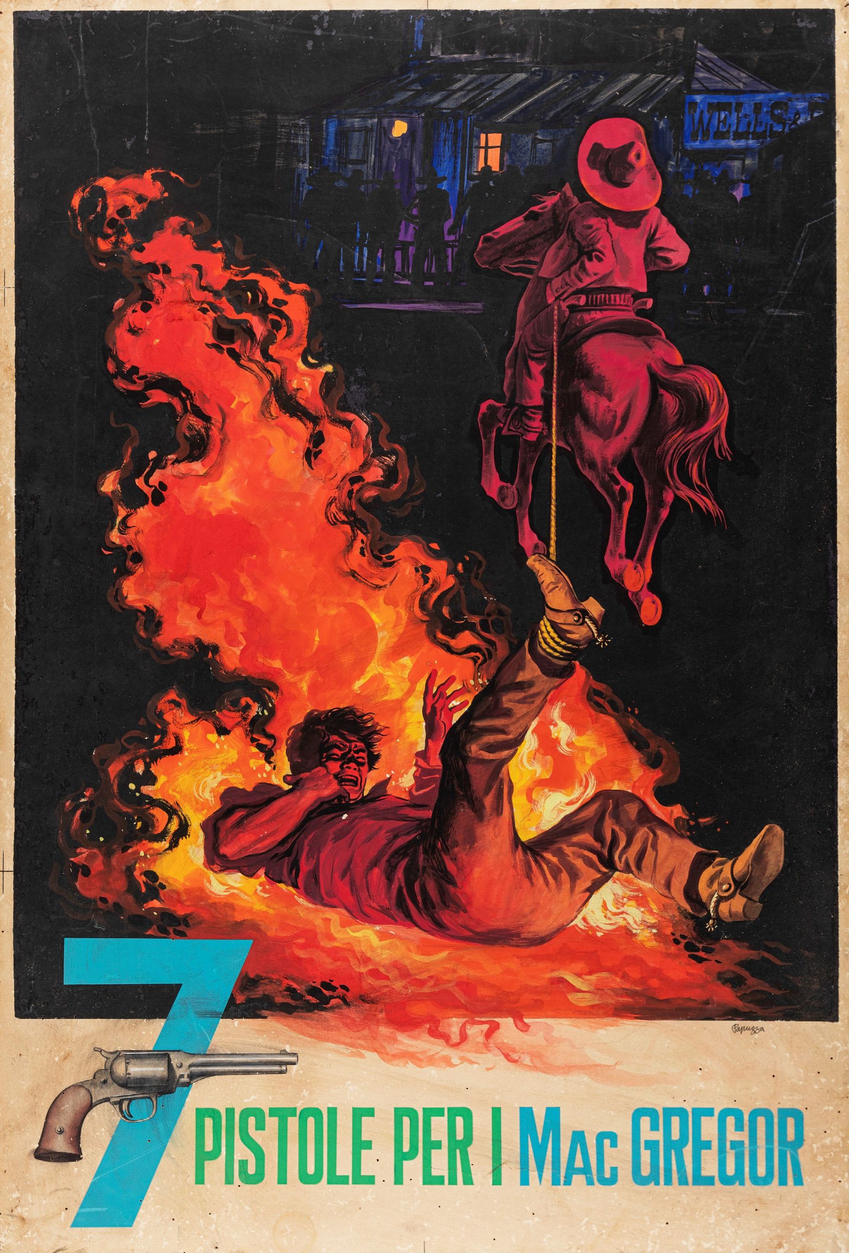 tempera su cartoncino applicato a legno, 62,5 x 93 cm 1966 Bozzetto originale realizzato da Papuzza per la locandina ufficiale del film 7 pistole per i MacGregor, diretto da Franco Giraldi con Robert Woods e Agata Flori nel 1966. Alcuni fori. Firmato.