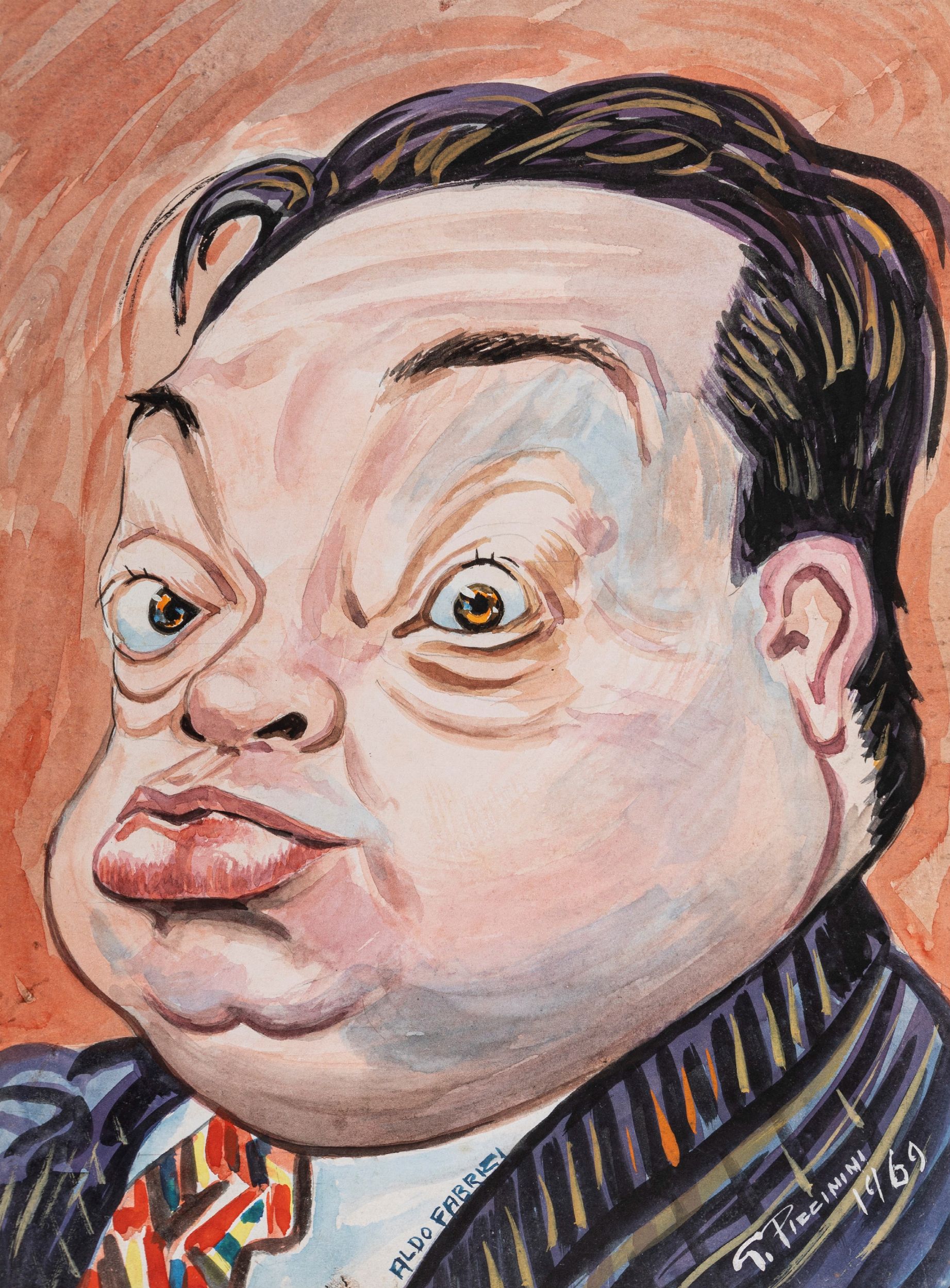 1969 Disegno originale realizzato da Piccinini per una serie di caricature di personaggi del cinema e dello spettacolo, pubblicato come poster allegato a Il Monello nel 1969. Firmato e datato.