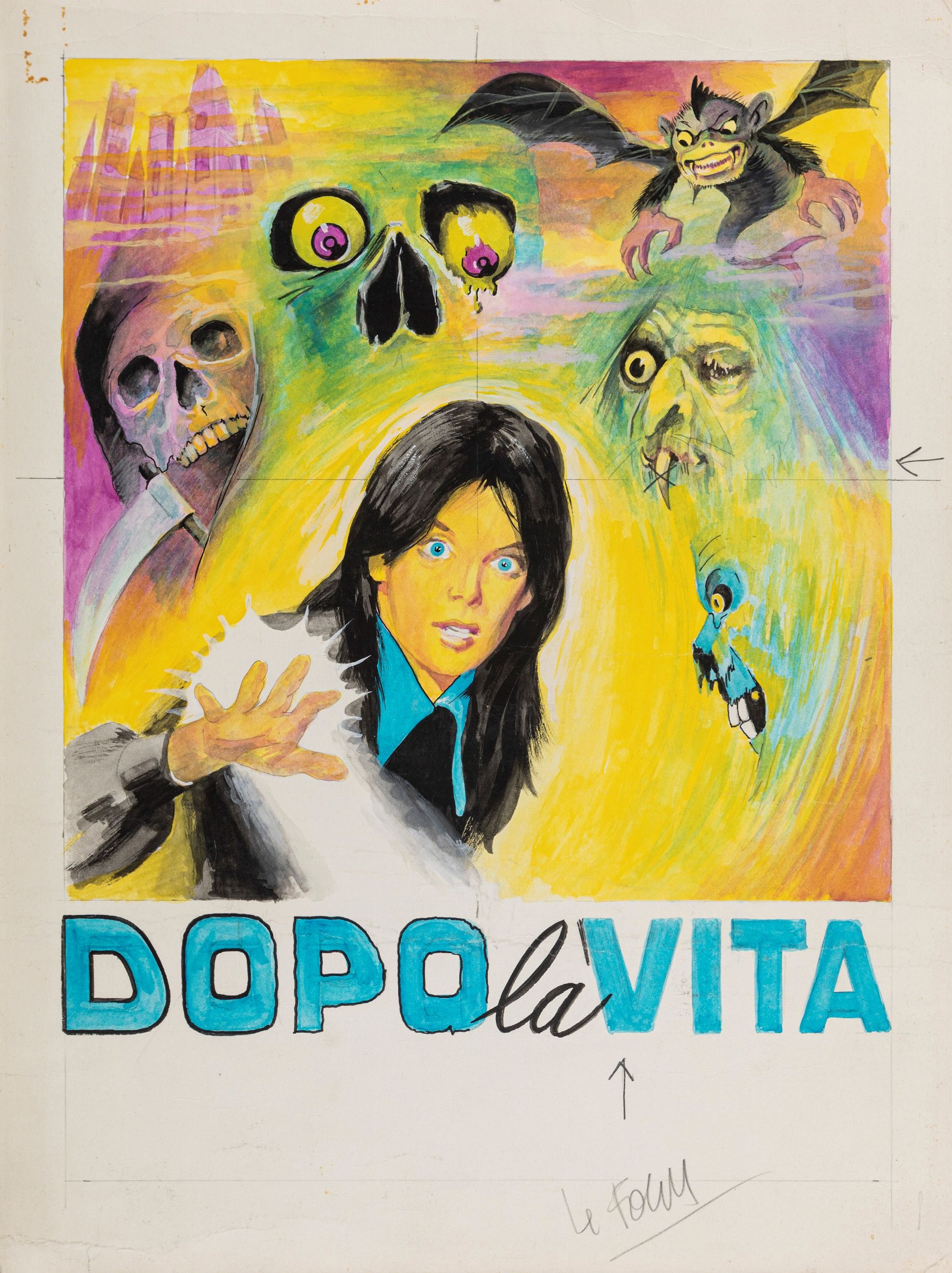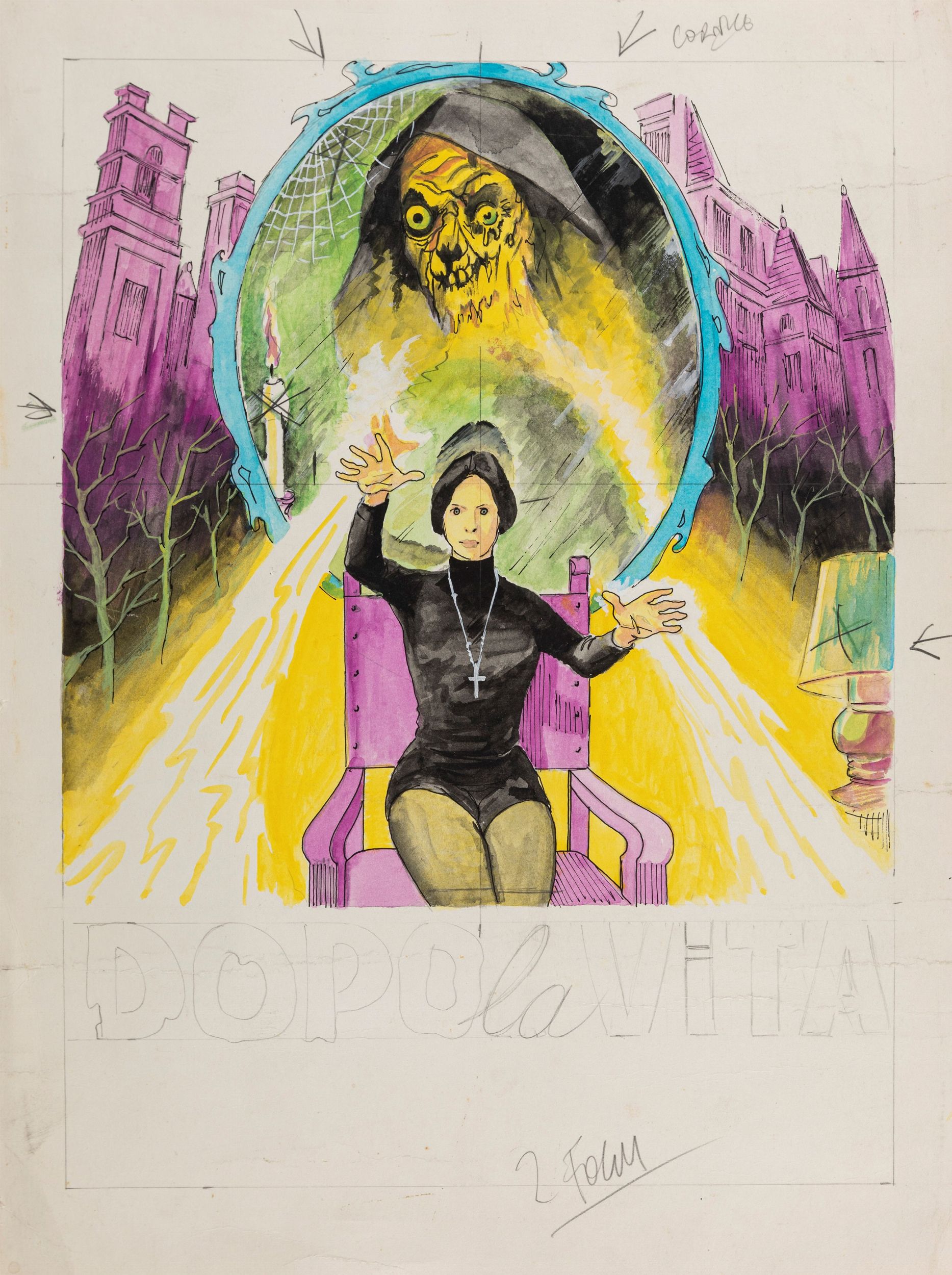 1973 Coppia di 2 bozzetti preliminari realizzati da Spagnoli per la locandina ufficiale del film Dopo la vita, diretto da John Hough con Pamela Franklin e Roddy McDowall nel 1973. Pieghe e piccoli strappi.