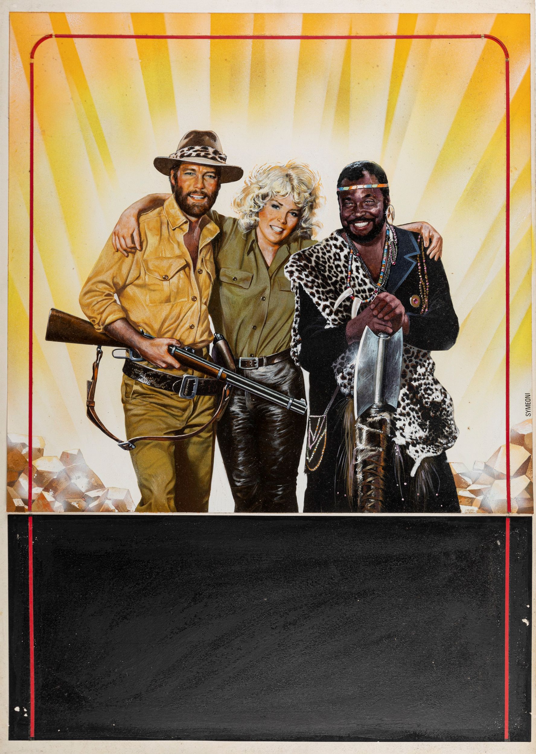 tempera e pellicola fotografica su cartone, 47,5 x 67 cm 1986 Bozzetto originale realizzato da Symeoni per la locandina ufficiale del film Gli avventurieri della città perduta, diretto da Gary Nelson con Richard Chamberlain e Sharon Stone nel 1986. Firmato.
