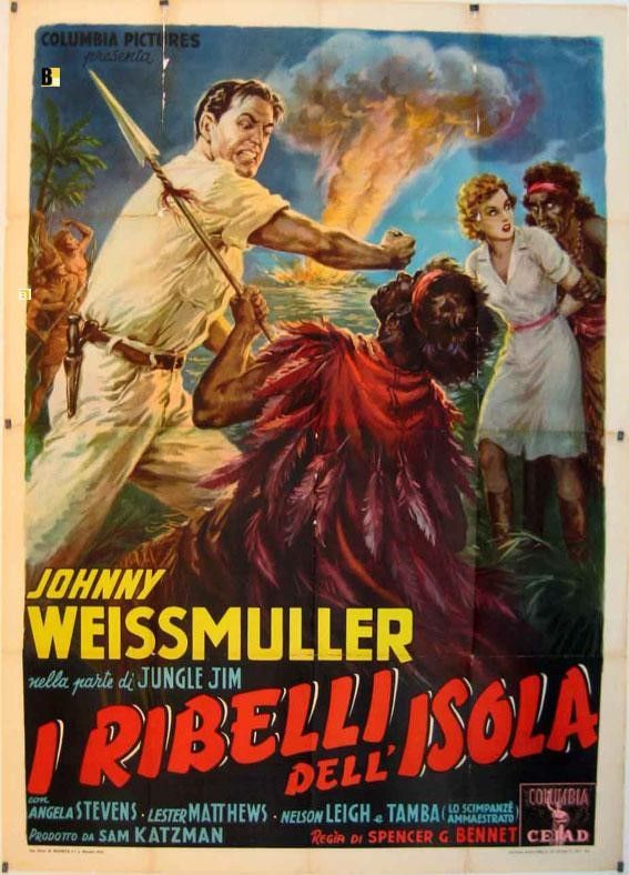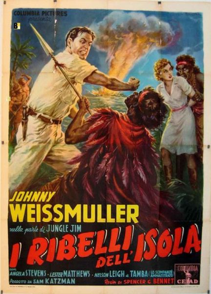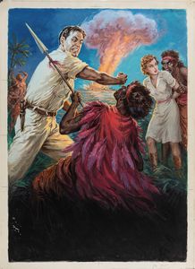 tempera su cartoncino, 48,5 x 67 cm 1953 Bozzetto originale realizzato da Ballester per la locandina ufficiale del film I ribelli dell'isola, diretto da Spencer Gordon Bennet con Angela Stevens e Johnny Weissmuller nel 1953. Fori di affissione agli angoli superiori. Firmato.