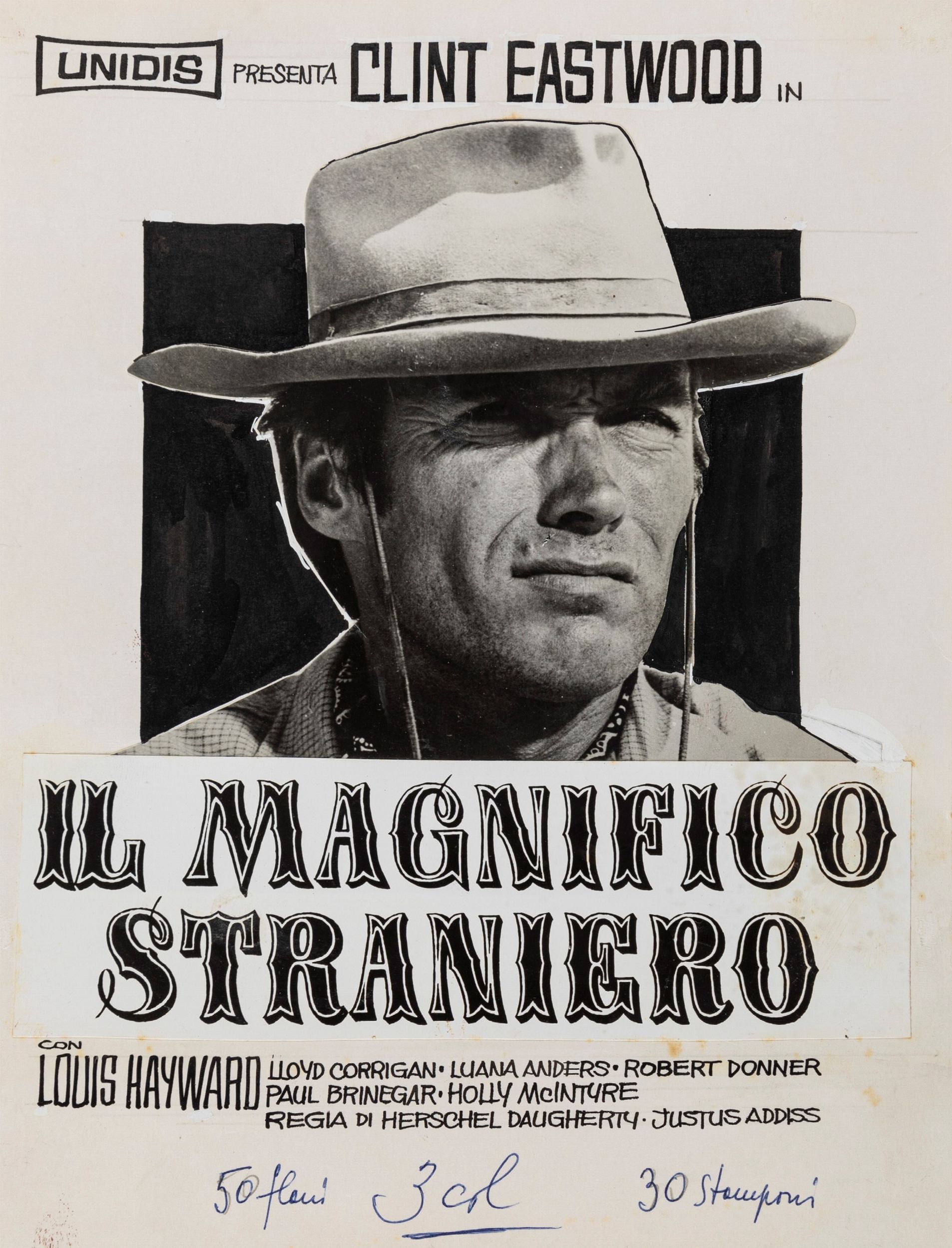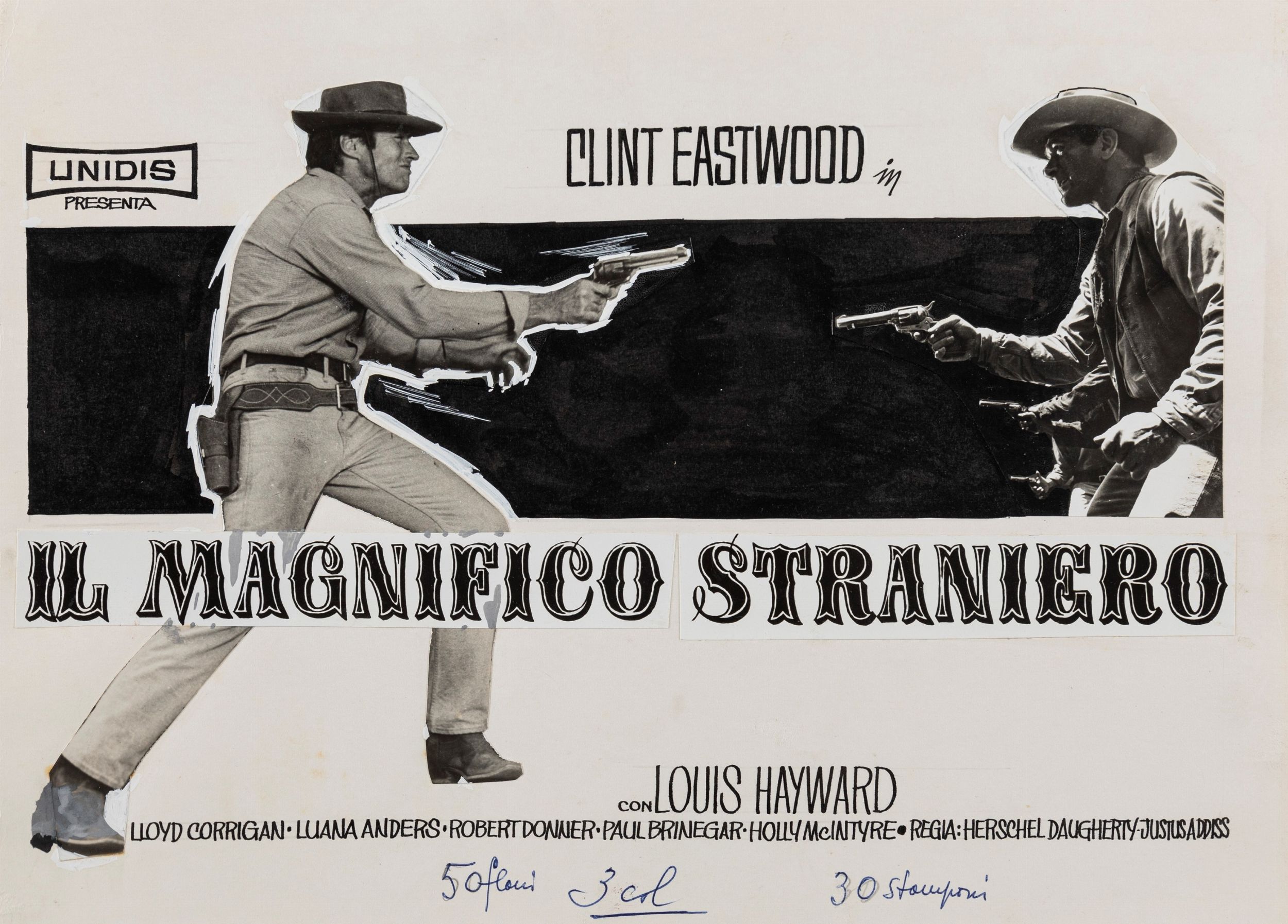 1966 Coppia di 2 bozzetti realizzati per il flano del film Il magnifico straniero, diretto da Herschel Daugherty e Justus Addiss con Clint Eastwood e Louis Hayward nel 1966.