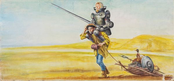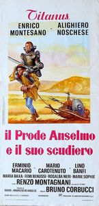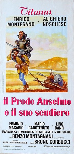 tempera su cartone, 70 x 33 cm 1972 Bozzetto originale realizzato da Maro per la locandina ufficiale del film Il prode Anselmo e il suo scudiero, diretto da Bruno Corbucci con Enrico Montesano, Alighiero Noschese e Lino Banfi nel 1972. Tracce di umidità.