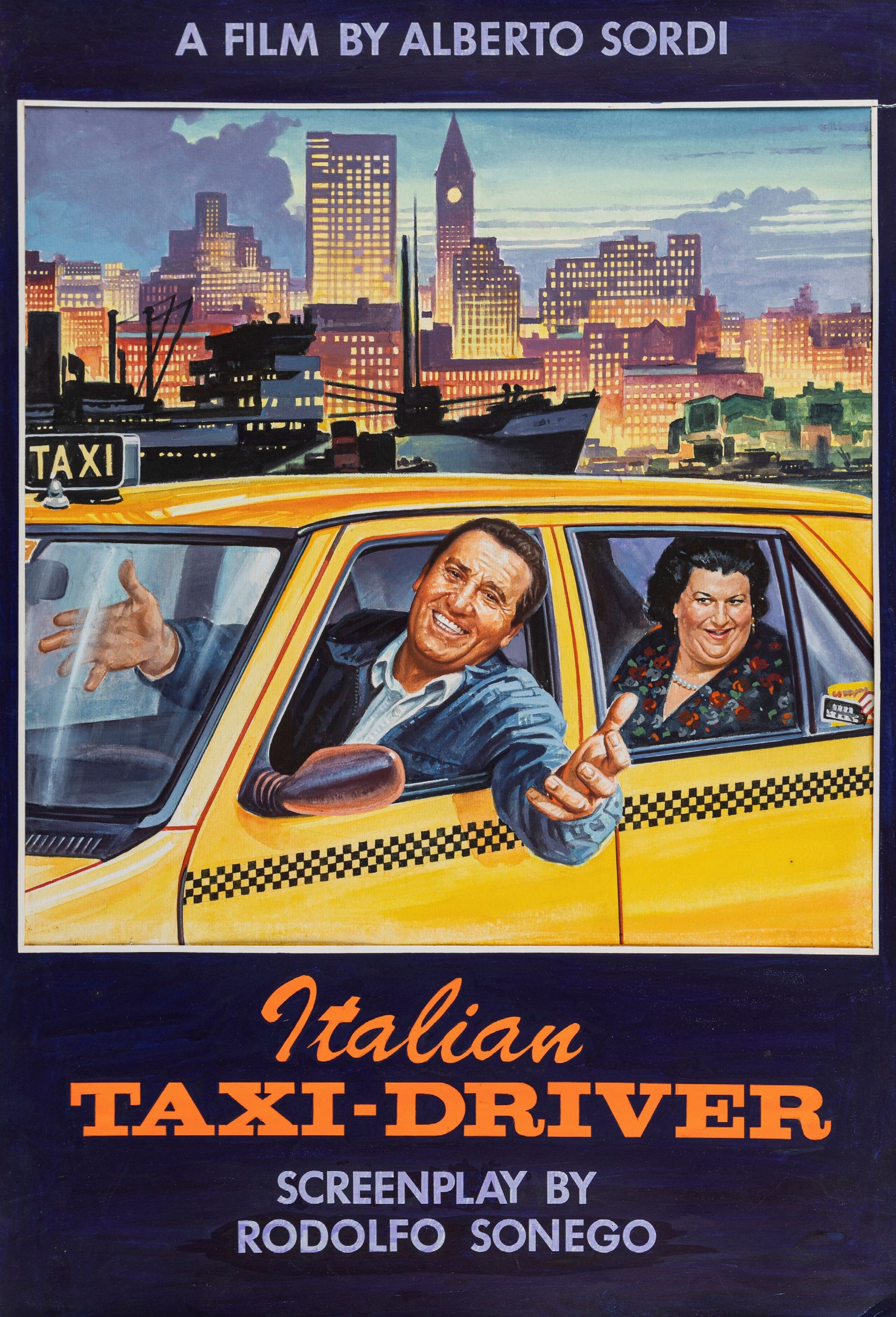 1987 Bozzetto originale realizzato per la locandina del film Italian Taxi Driver, diretto da Alberto Sordi con Anna Longhi e Alberto Sordi nel 1987. Lieve piega all'angolo inferiore destro.