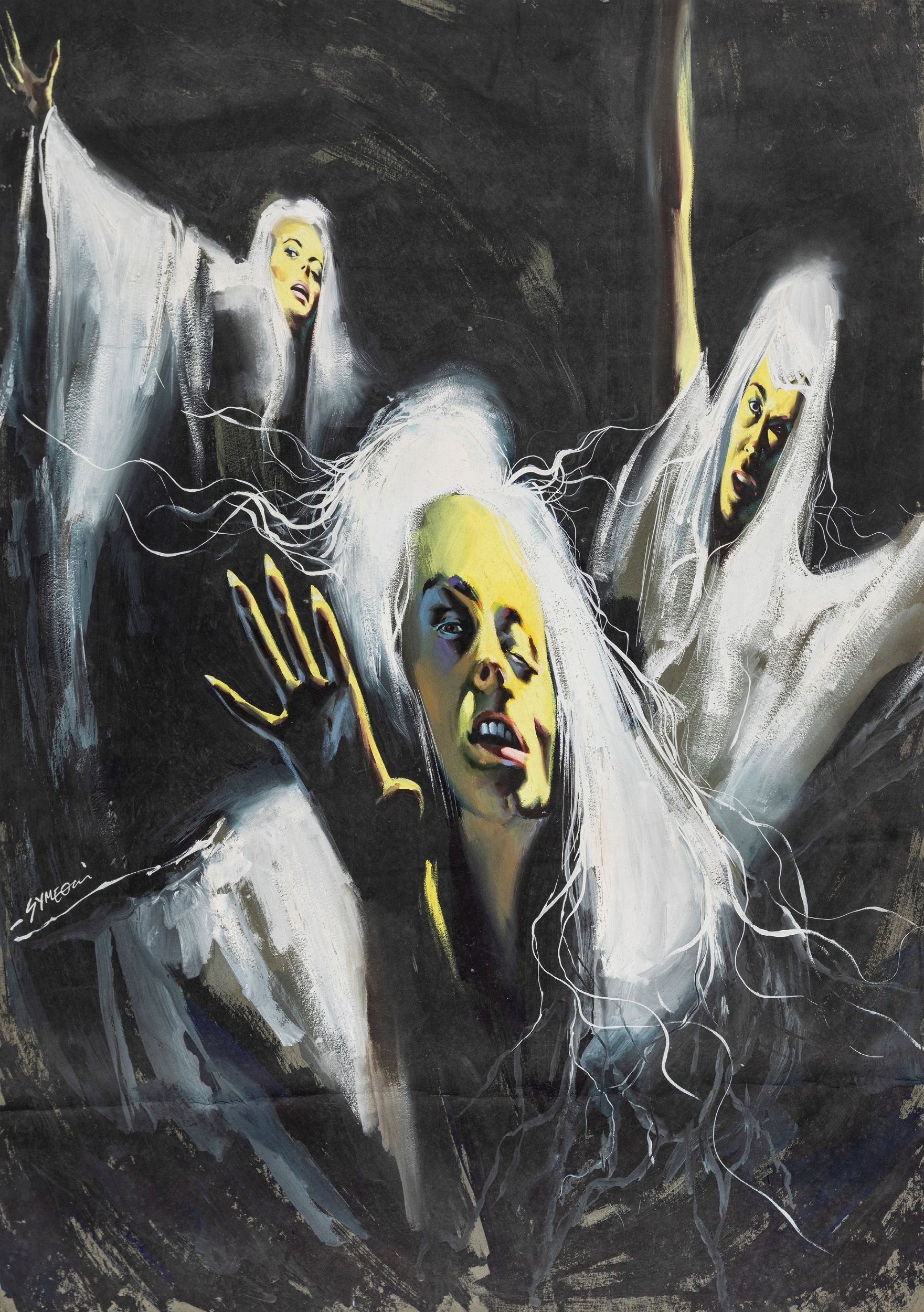 tempera su cartoncino applicato a cartoncino, 58 x 83 cm 1961 Bozzetto originale realizzato da Symeoni per la locandina ufficiale del film La maschera e l'incubo, diretto da Julian Roffman con Paul Stevens e Claudette Nevins nel 1961. Alcune pieghe, fori di affissione ai margini. Firmato.