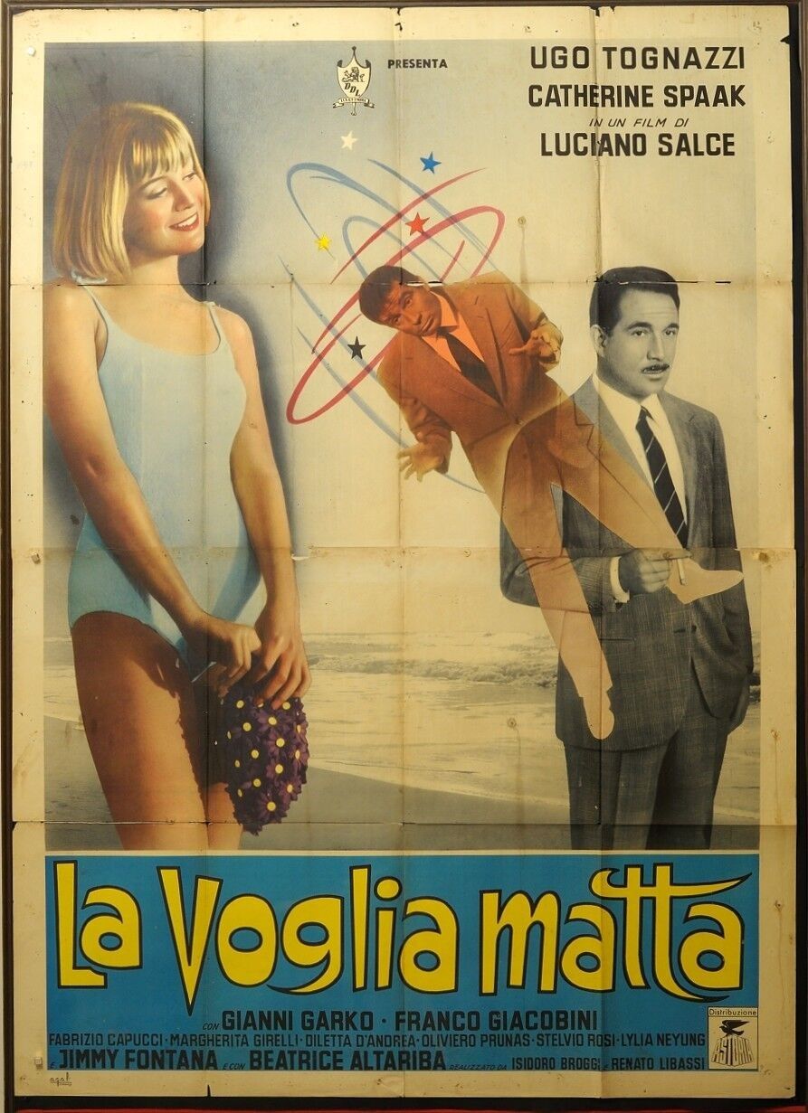 1962 Bozzetto originale realizzato per la locandina ufficiale del film La voglia matta, diretto da Luciano Salce con Catherine Spaak e Ugo Tognazzi nel 1962. Foro di affissione al margine superiore.