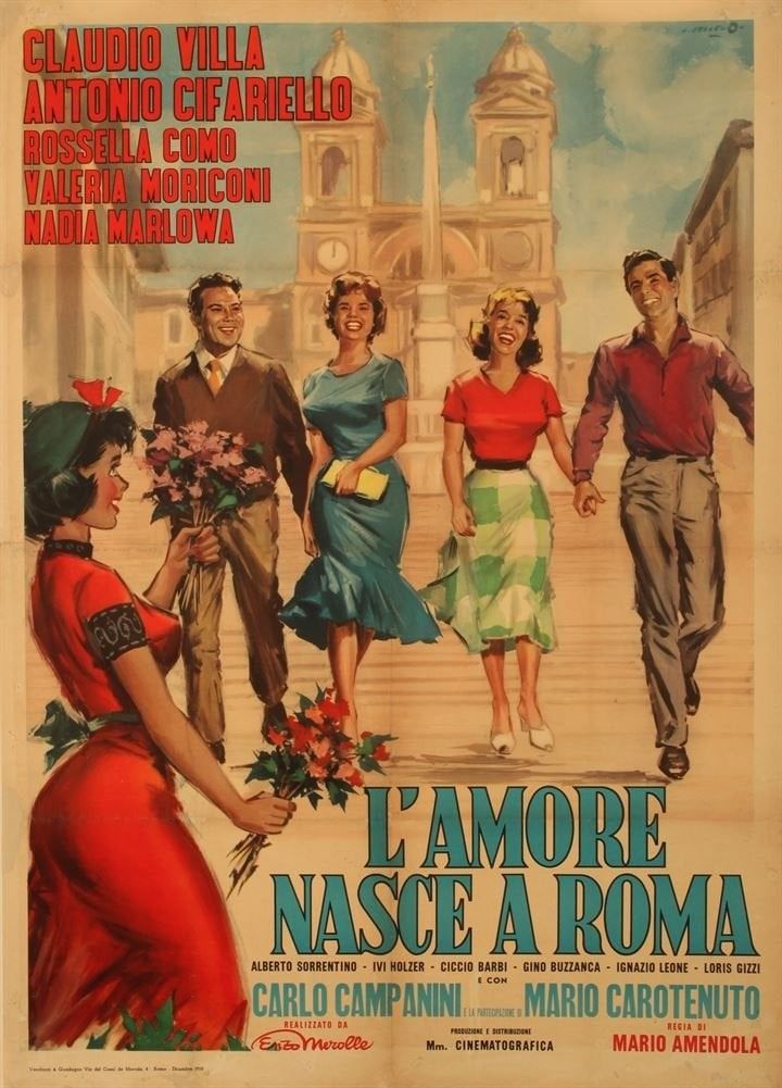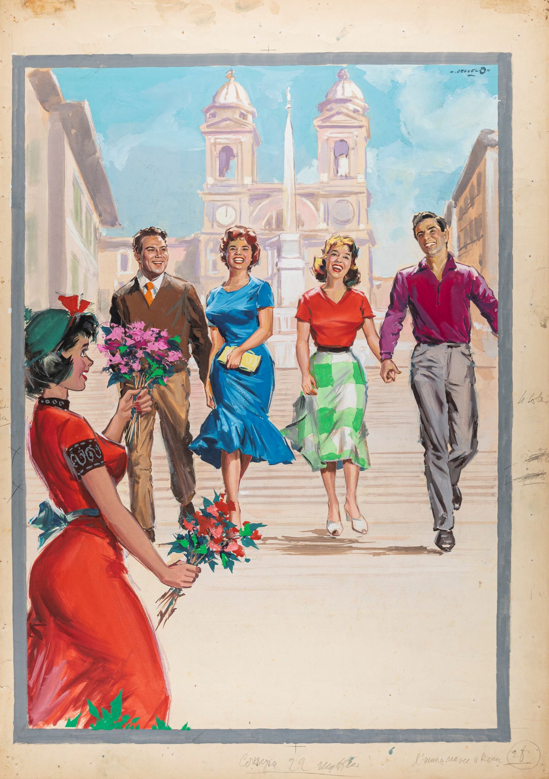 tempera su cartoncino, 70 x 100 cm 1958 Bozzetto originale realizzato da Cesselon per la locandina ufficiale del film L'amore nasce a Roma, diretto da Mario Amendola con Claudio Villa e Antonio Cifariello nel 1958. Lievi pieghe, piccoli strappi e fori di affissione ai margini. Firmato.