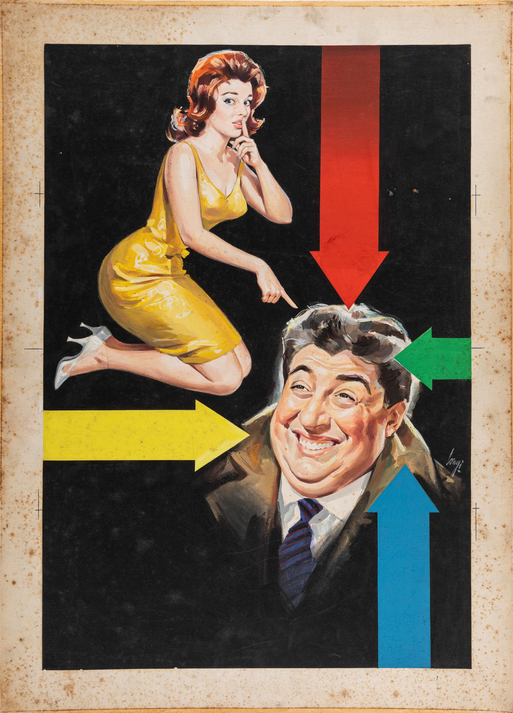 1962 Bozzetto originale realizzato da Longi per la locandina ufficiale del film L'assassino si chiama Pompeo, diretto da Marino Girolami con Gino Bramieri e Gina Rovere nel 1962. Firmato.