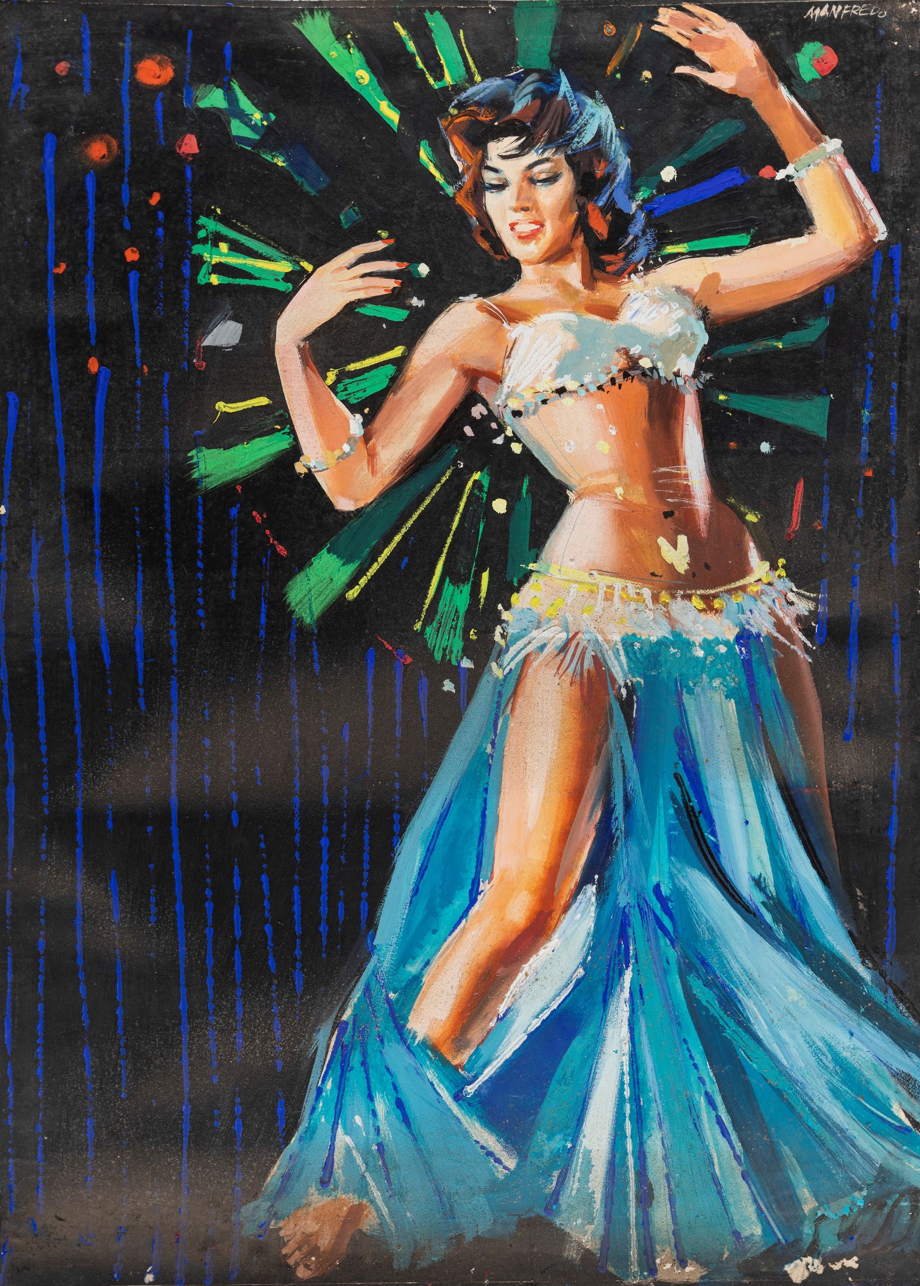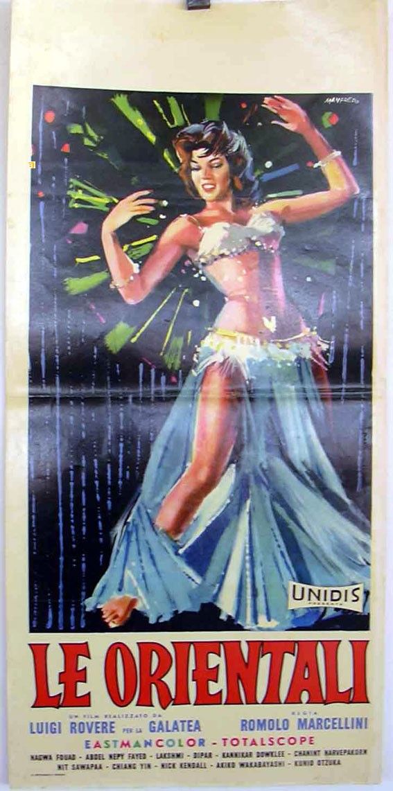 tempera su cartoncino, 50 x 69,5 cm 1960 Bozzetto originale realizzato da Acerbo per la locandina ufficiale del film Le orientali, diretto da Romolo Marcellini con Nagwa Fouad e Akiko Wakabayashi nel 1960. Tracce di umidità e fori di affissione ai margini. Firmato.