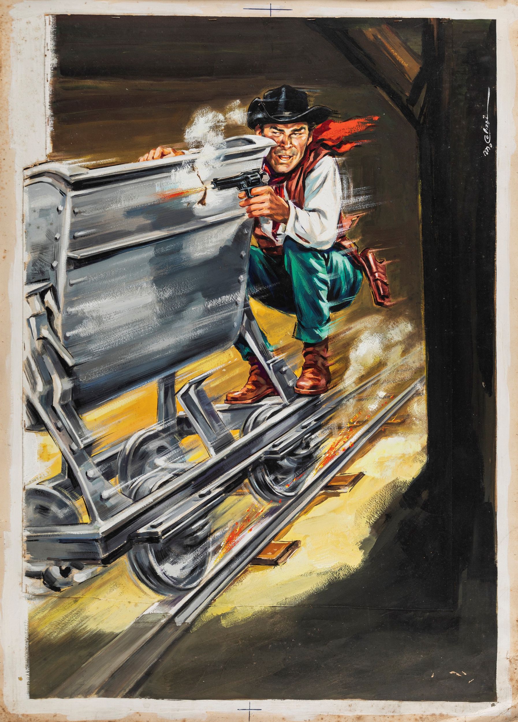 tempera su cartoncino, 44 x 60,5 cm 1964 Bozzetto originale realizzato da Colizzi per la locandina ufficiale del film Le pistole non discutono, diretto da Mario Caiano con Rod Cameron e Angel Aranda nel 1964. Pieghe e piccoli strappi agli angoli inferiori, punti metallici al margine superiore. Firmato.