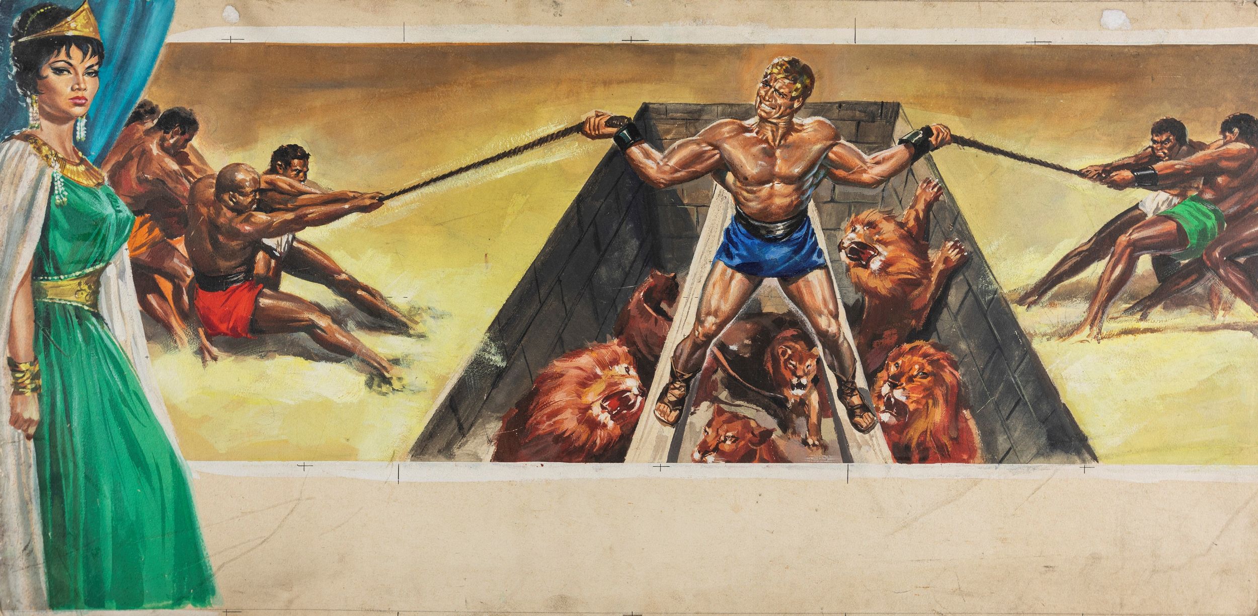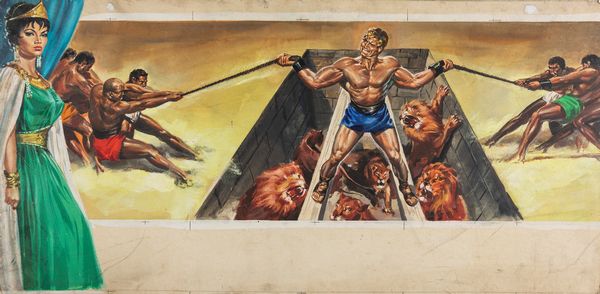 tempera su cartone, 84,5 x 42 cm 1961 Bozzetto originale realizzato da De Seta per la locandina ufficiale del film Maciste nella terra dei ciclopi, diretto da Antonio Leonviola con Gordon Mitchell e Raffaella Carrà nel 1961. Tracce di umidità al margine sinistro.
