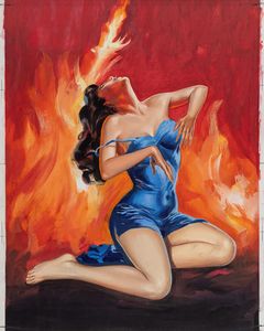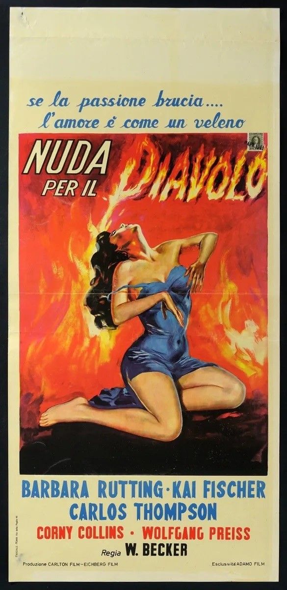 1958 Bozzetto originale realizzato da Casaro per la locandina ufficiale del film Nuda per il diavolo, diretto da Wolfgang Becker con Barbara Rutting e Kay Fisher nel 1958.