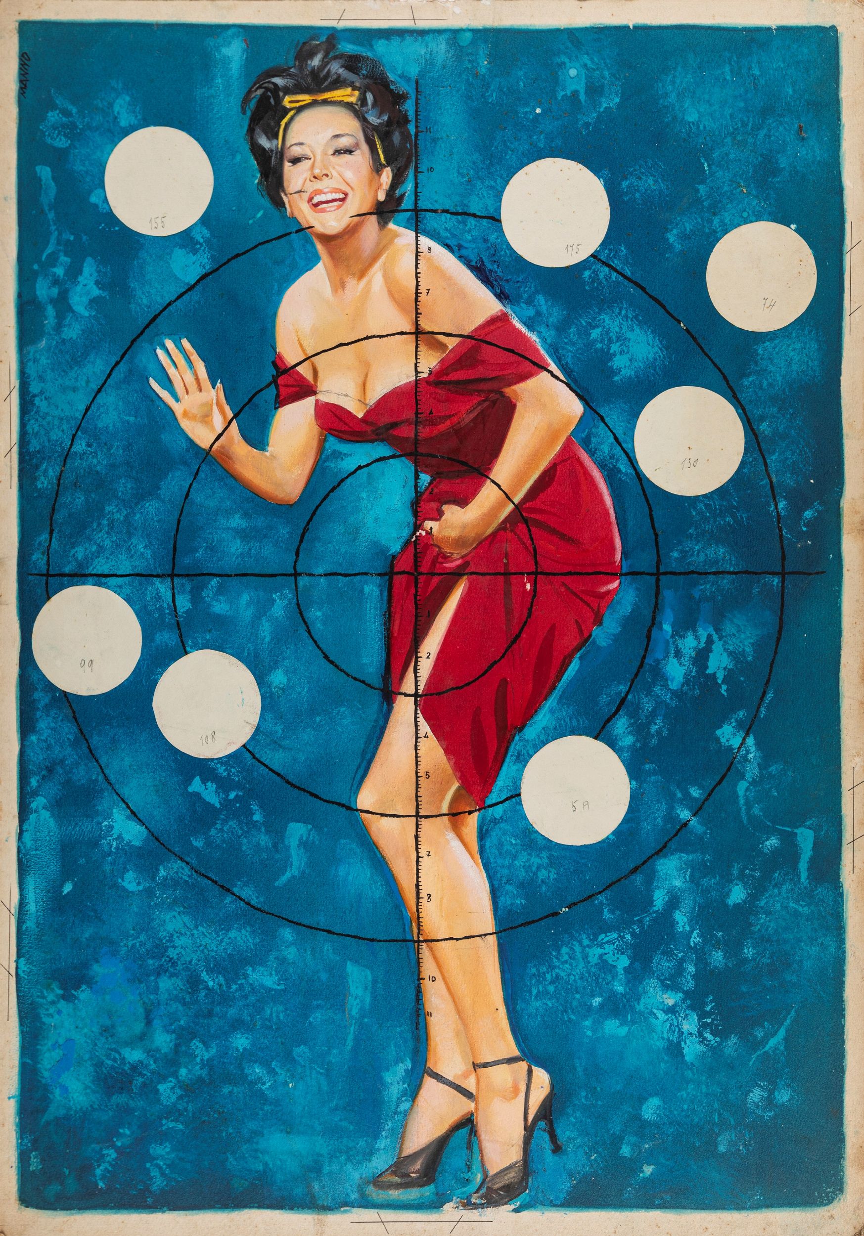 tempera su cartone, 43,5 x 62 cm 1963 Bozzetto originale realizzato da Manno per la locandina ufficiale del film Obiettivo ragazze, diretto da Mario Mattoli con Franco Franchi e Ciccio Ingrassia nel 1963. Lieve piega all'angolo superiore sinistro. Firmato.