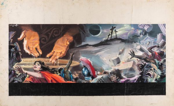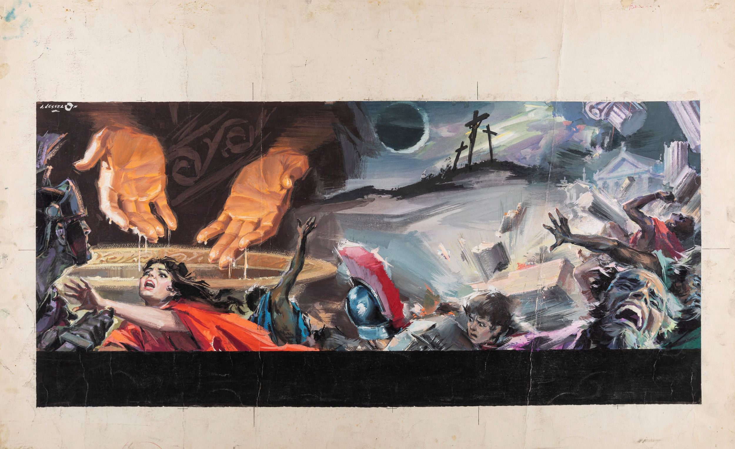tempera su cartoncino, 100 x 62 cm 1962 Bozzetto originale realizzato da Cesselon per la locandina ufficiale del film Ponzio Pilato, diretto da Gian Paolo Callegari e Irving Rapper con Jean Marais e John Drew Barrymore nel 1962. Pieghe, piccoli strappi ai margini. Firmato.