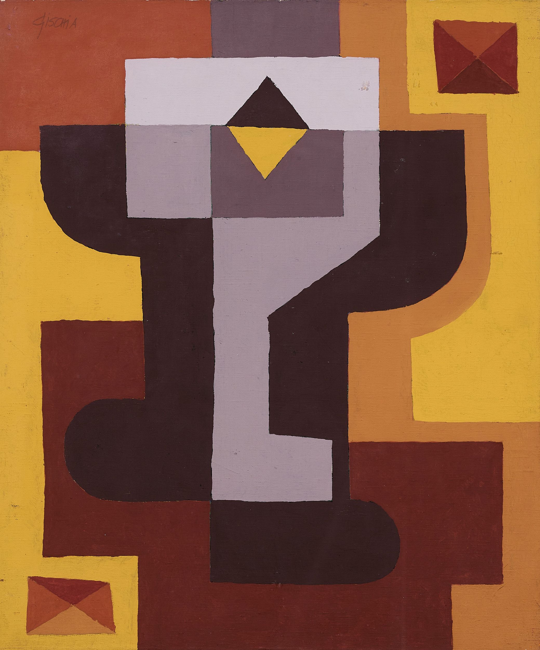 Olio su tela, cm. 55x46 1973 Firma in alto a sinistra: Gischia; titolo, scritta, firma e data al verso sulla tela: 264 / Fruttiera / 10 F / Gischia 73; sul telaio: timbro Galleria R. Rotta, Genova, con scritta con dati dell'opera e indicazione n. 5 mostra personale 1974.