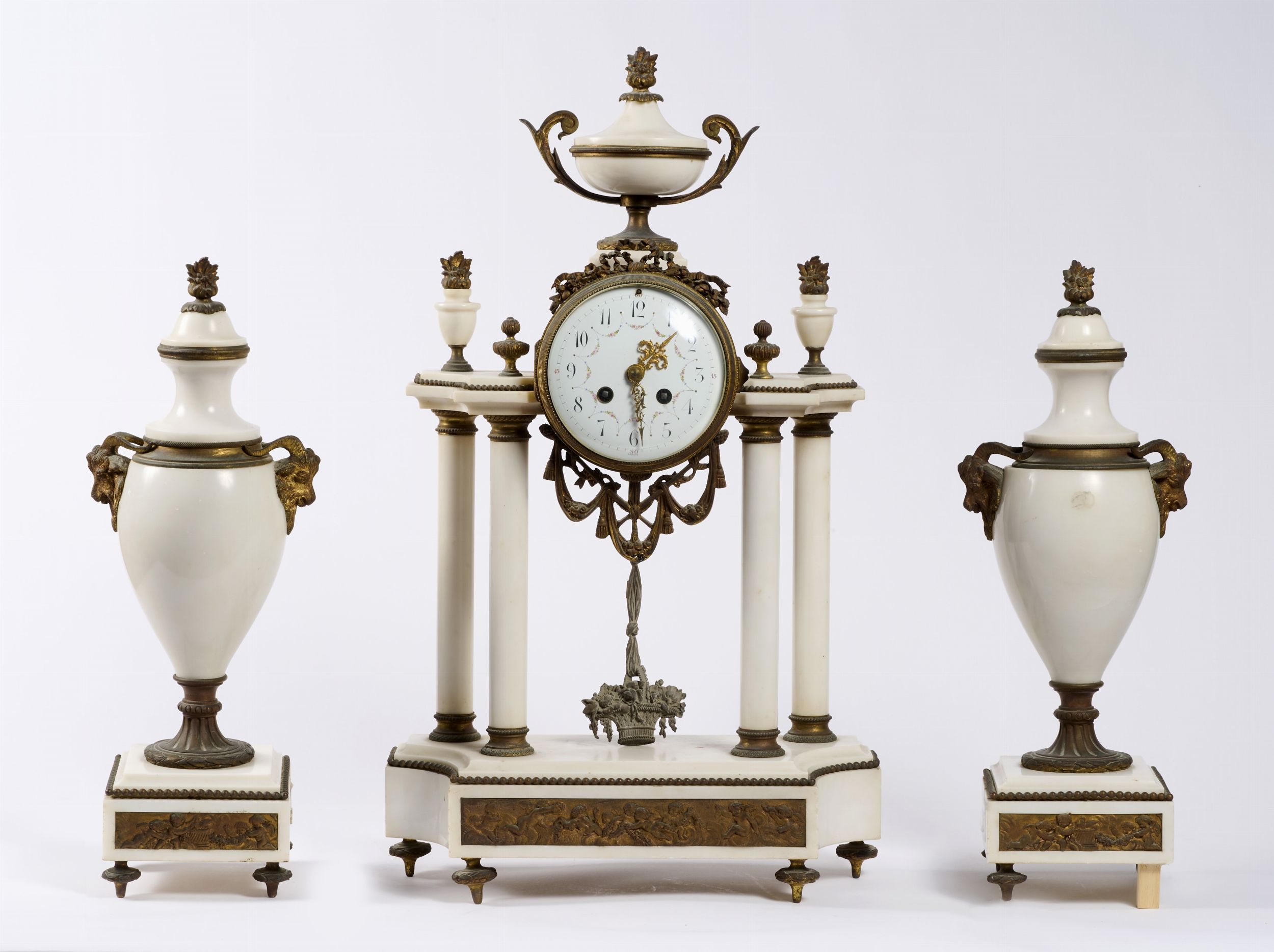 Trittico composto da un orologio e due vasi in marmo bianco con applicazioni in [..]