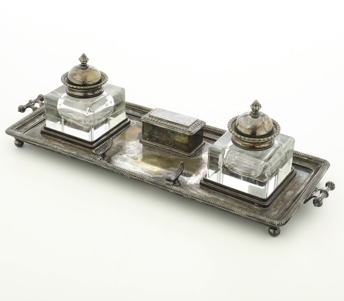 Calamaio in metallo argentato con ampolle in vetro. XX secolo