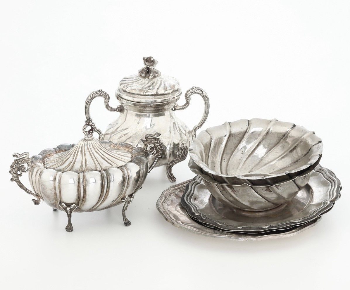 Due zuccheriere, due coppe da macedonia e tre piattini. Argenteria italiana del [..]