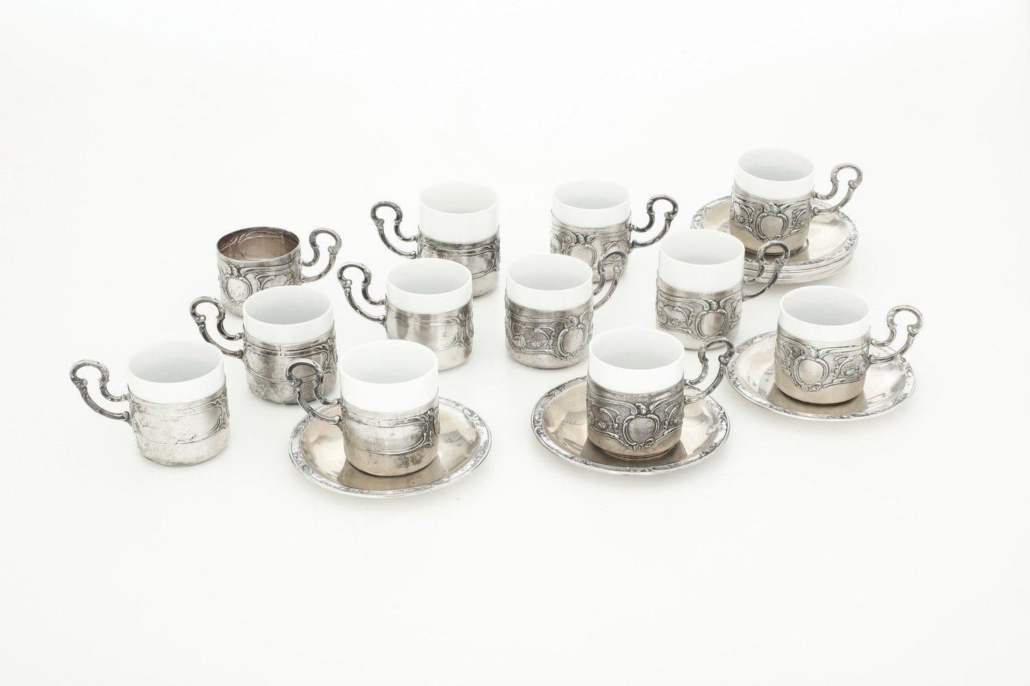 Lotto composto da 12 piattini caffe, 11 porta tazzine in argento e 10 tazzine in [..]