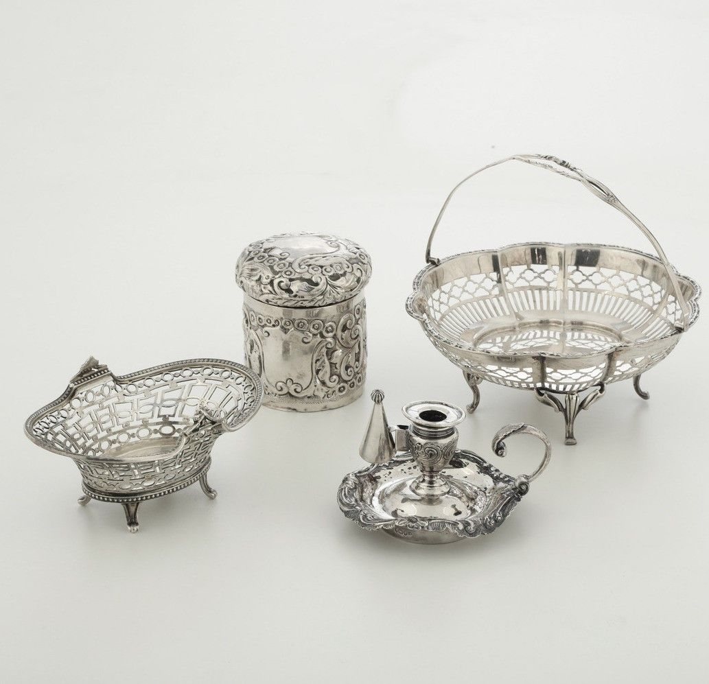 Lotto composto da cestino tondo, cestino ovale scatolina e bugia, Inghilterra XIX-XX [..]