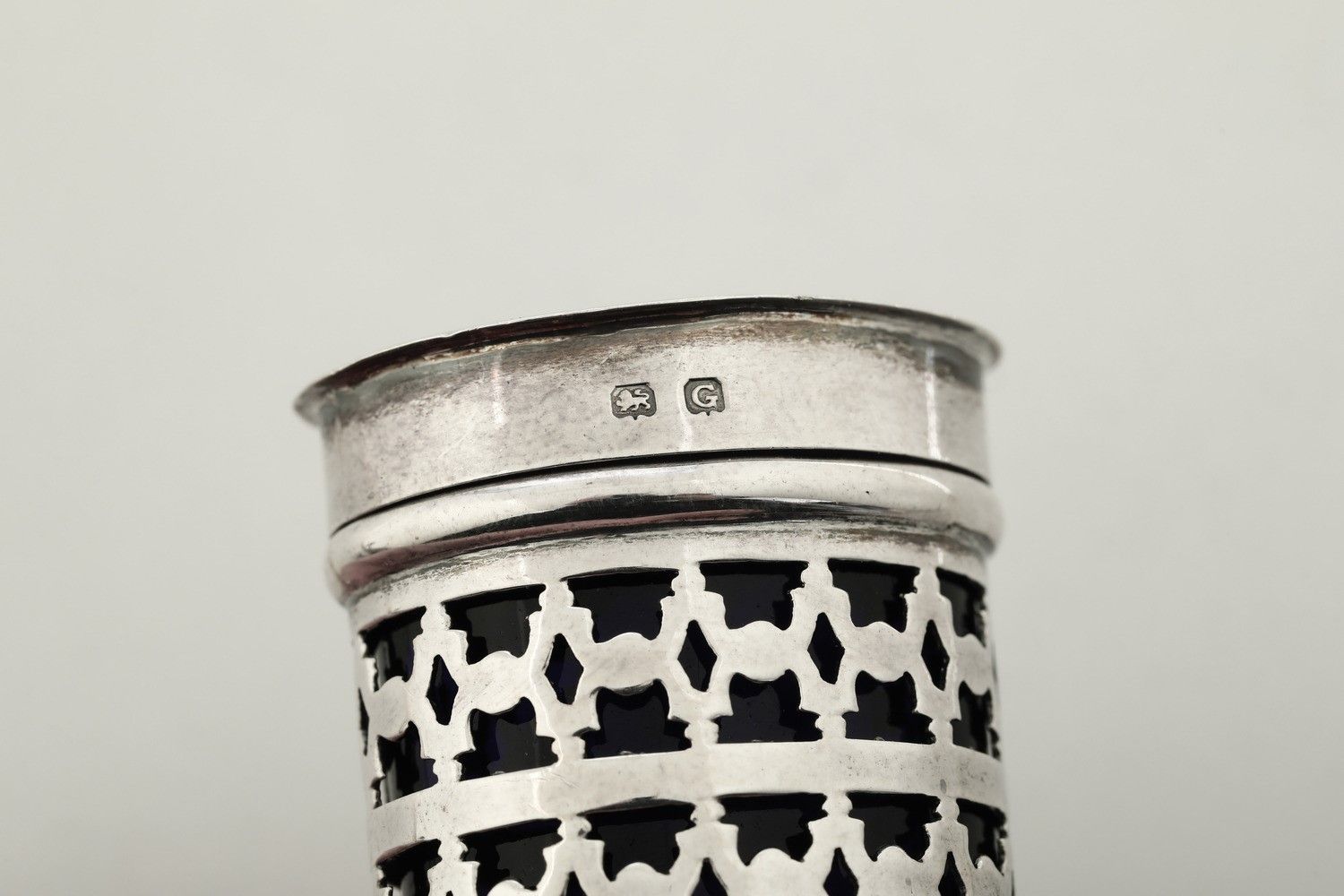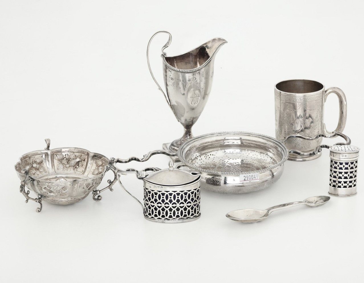 Lotto composto da colino, doppio cucchiaio, coppetta, mostardiera con vetro blu, [..]