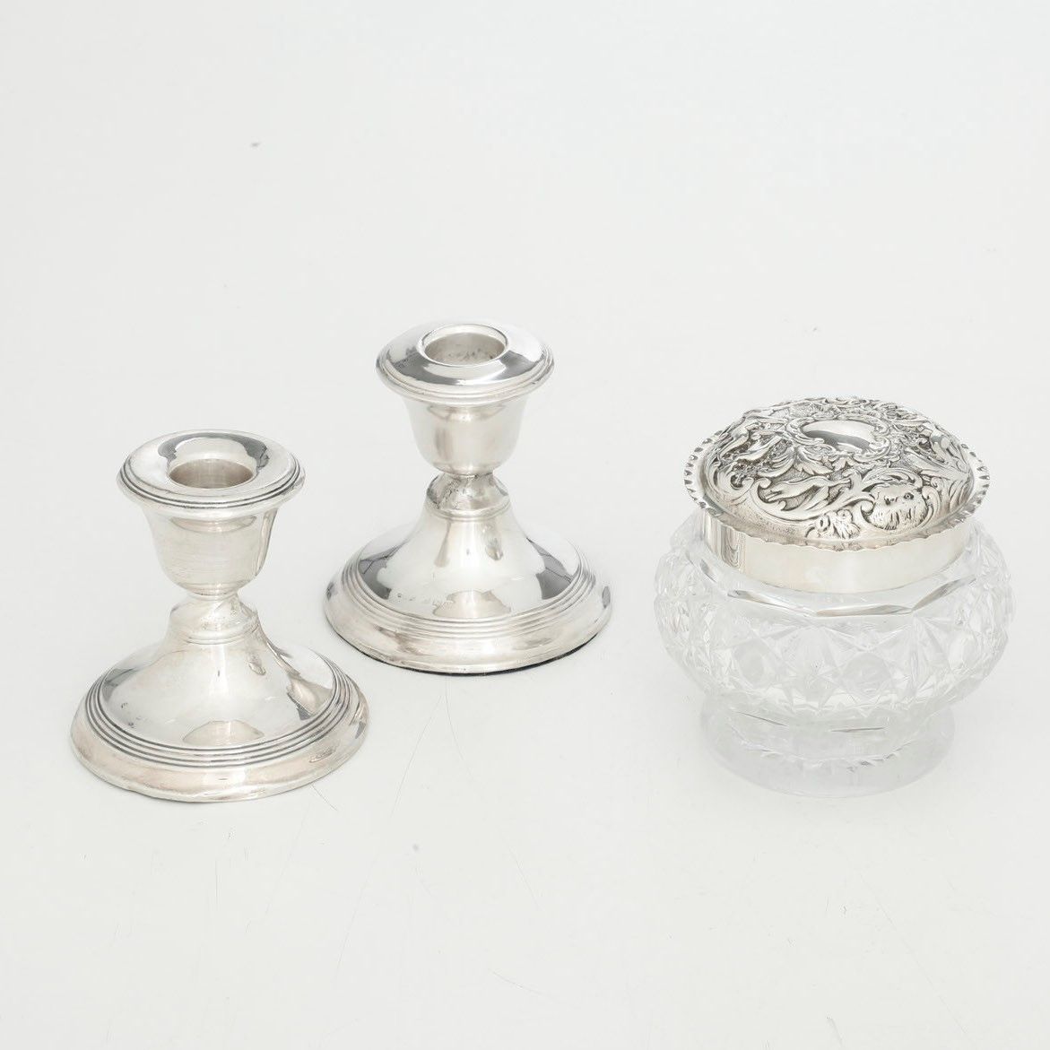 Lotto composto da coppia di portacandela e contenitore in cristallo con coperchio [..]